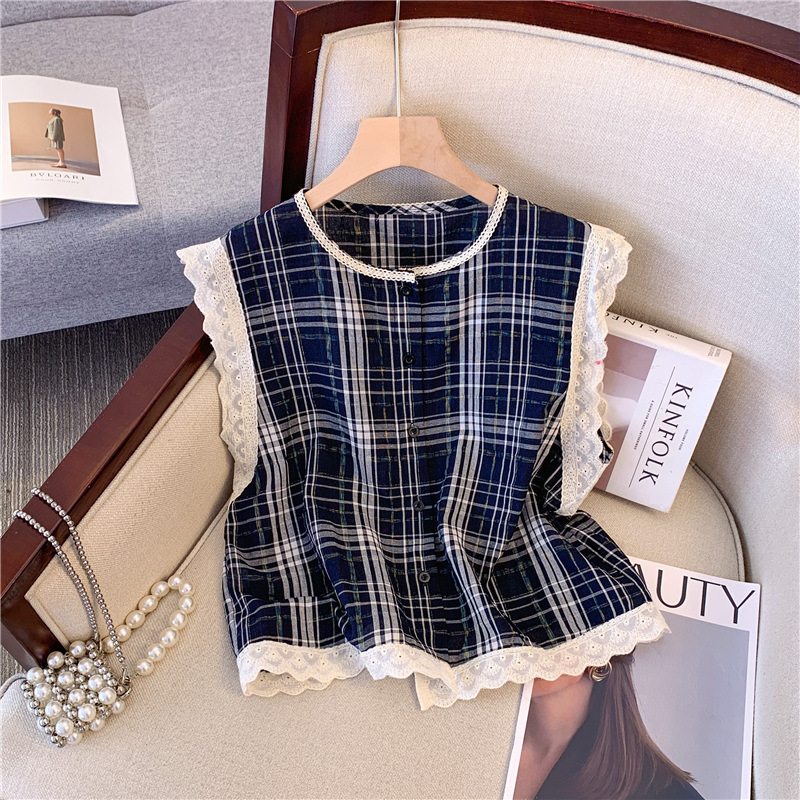 新款蕾丝花边格子小飞袖上衣棉麻无袖背心衬衫