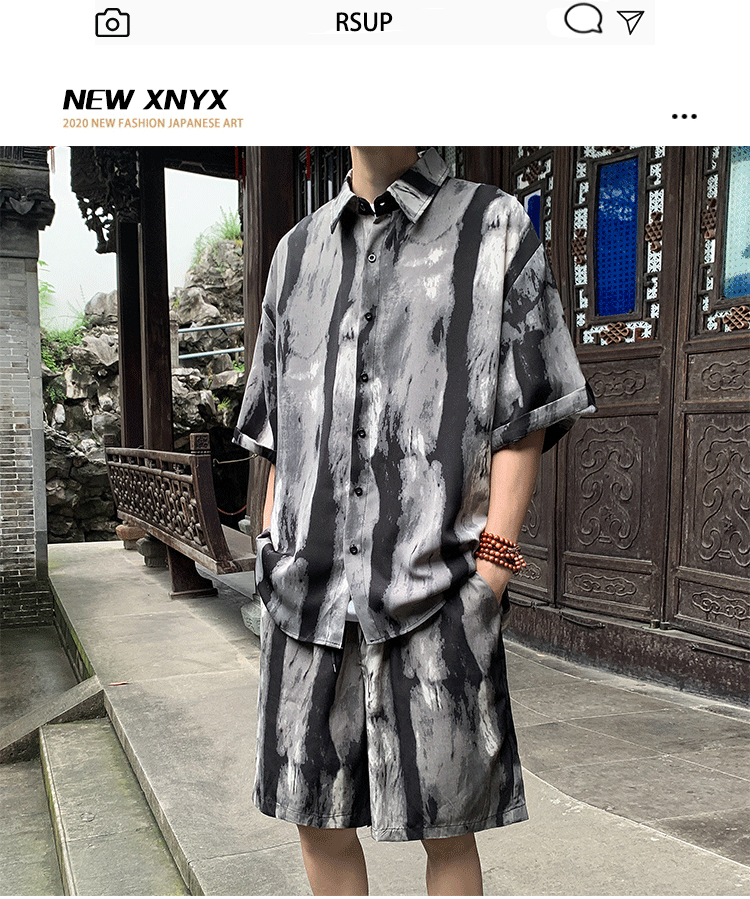 夏季海边度假复古花衬衫套装男水墨扎染两件套速干冰丝休闲沙滩裤