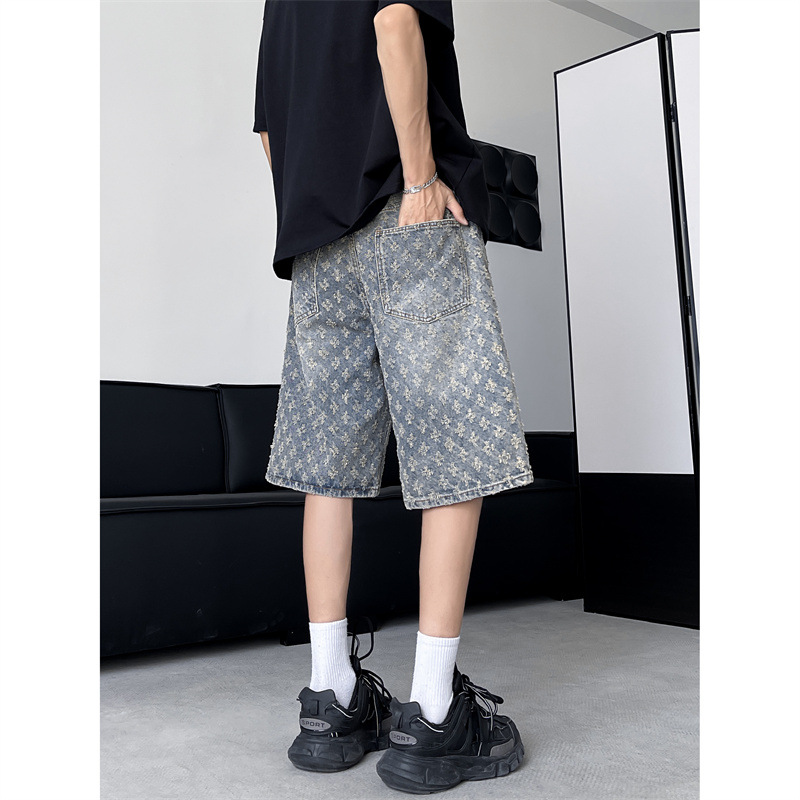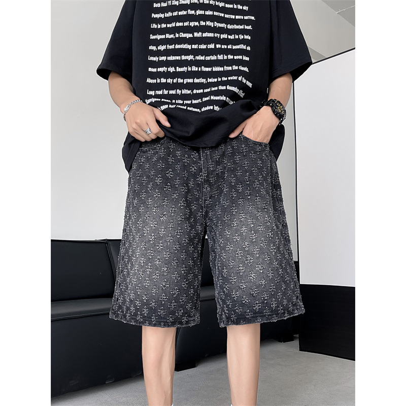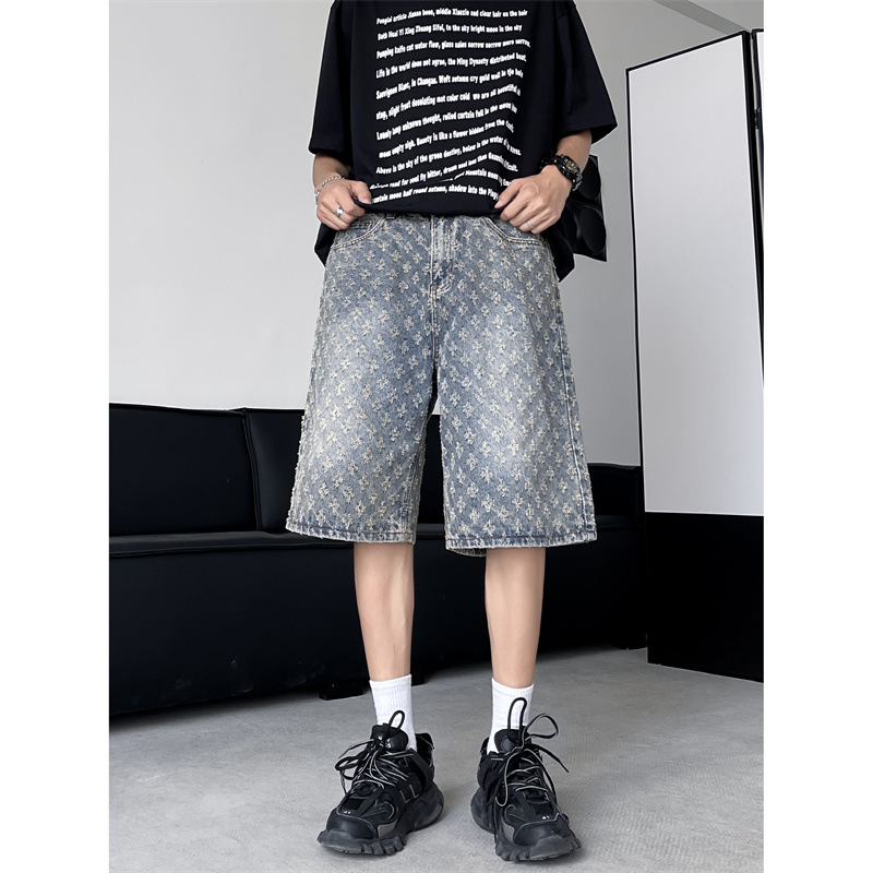 高街vibe风满印提花牛仔短裤男生夏季新款复古宽松直筒阔腿五分裤