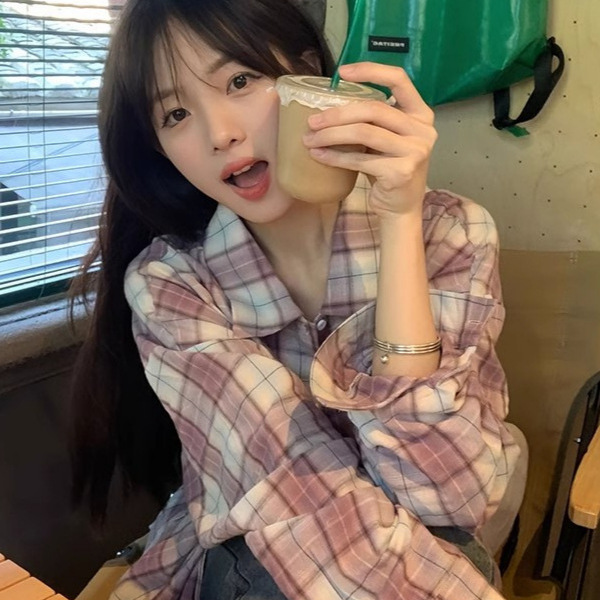 港风衬衣新款女装设计感小众上衣复古防晒紫色格子衬衫外套女夏季