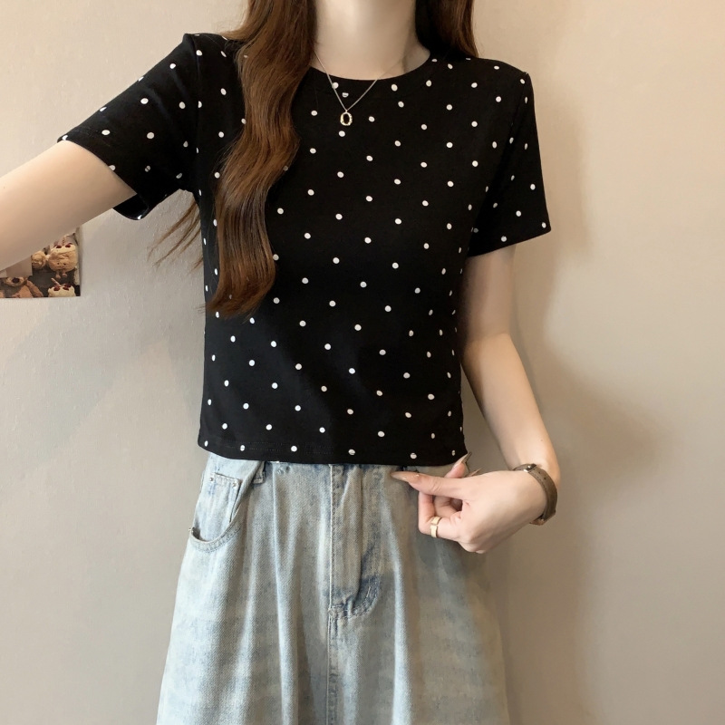 短袖T恤女修身短款小个子夏装韩版百搭波点上衣半袖潮