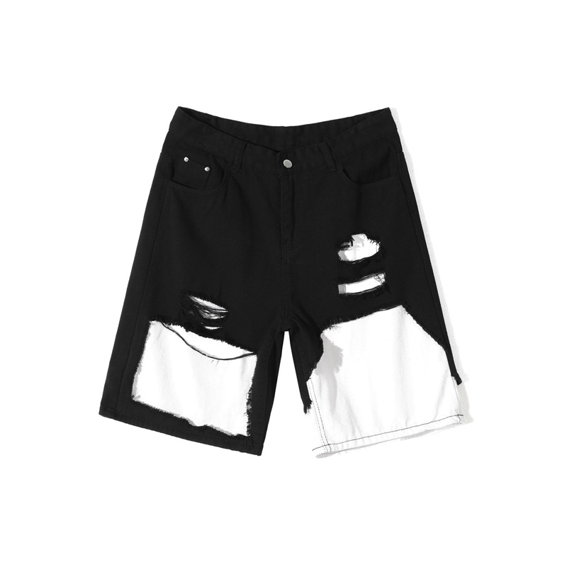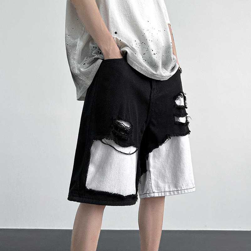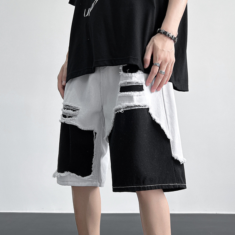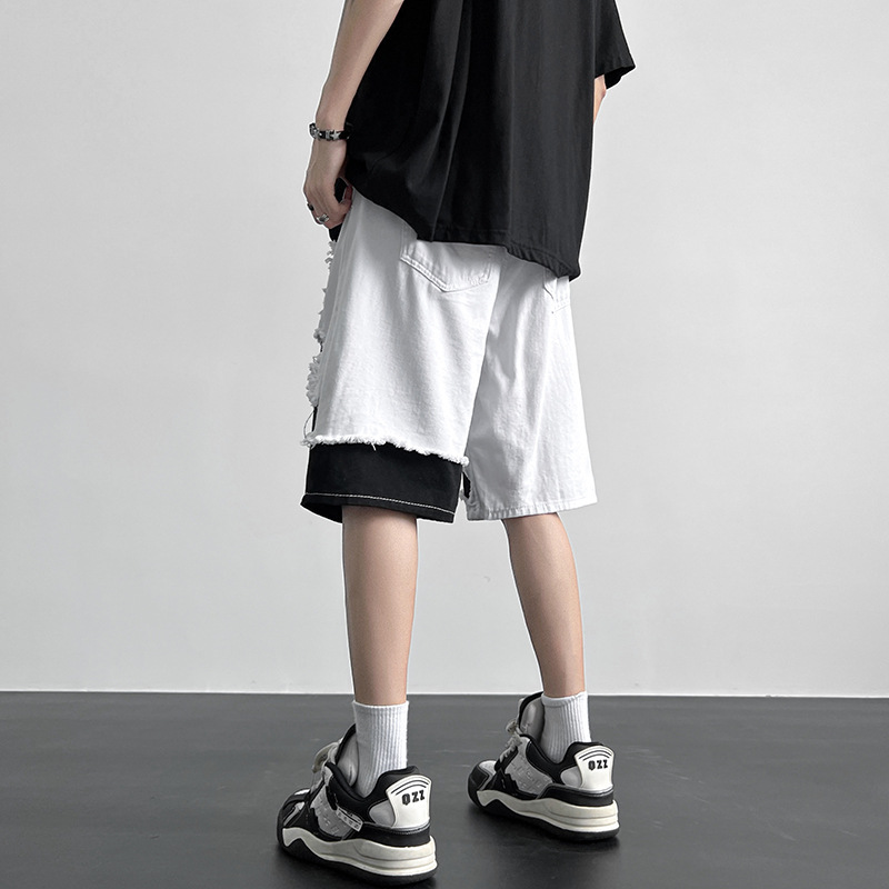夏季拼接破洞牛仔短裤男日系街头休闲宽松百搭个性帅气阔腿中裤子