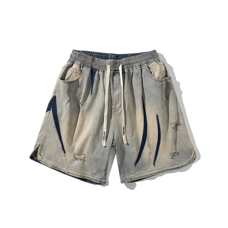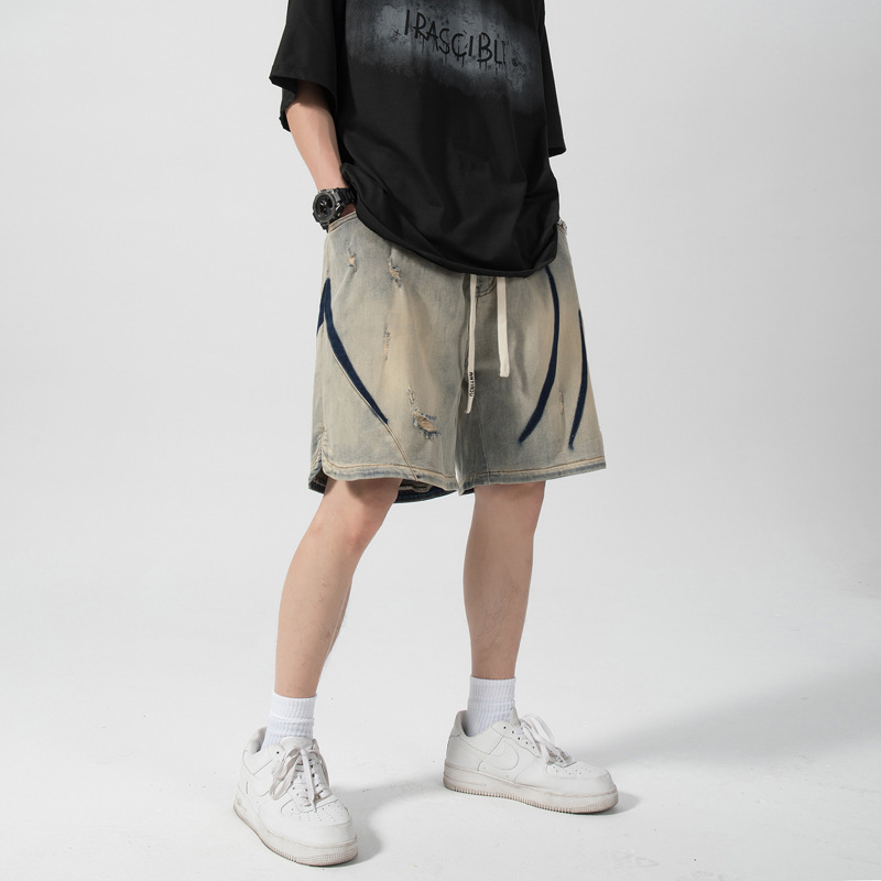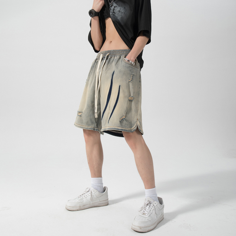 破洞牛仔短裤男夏季设计感休闲嘻哈潮牌ins百搭抽绳直筒五分裤子