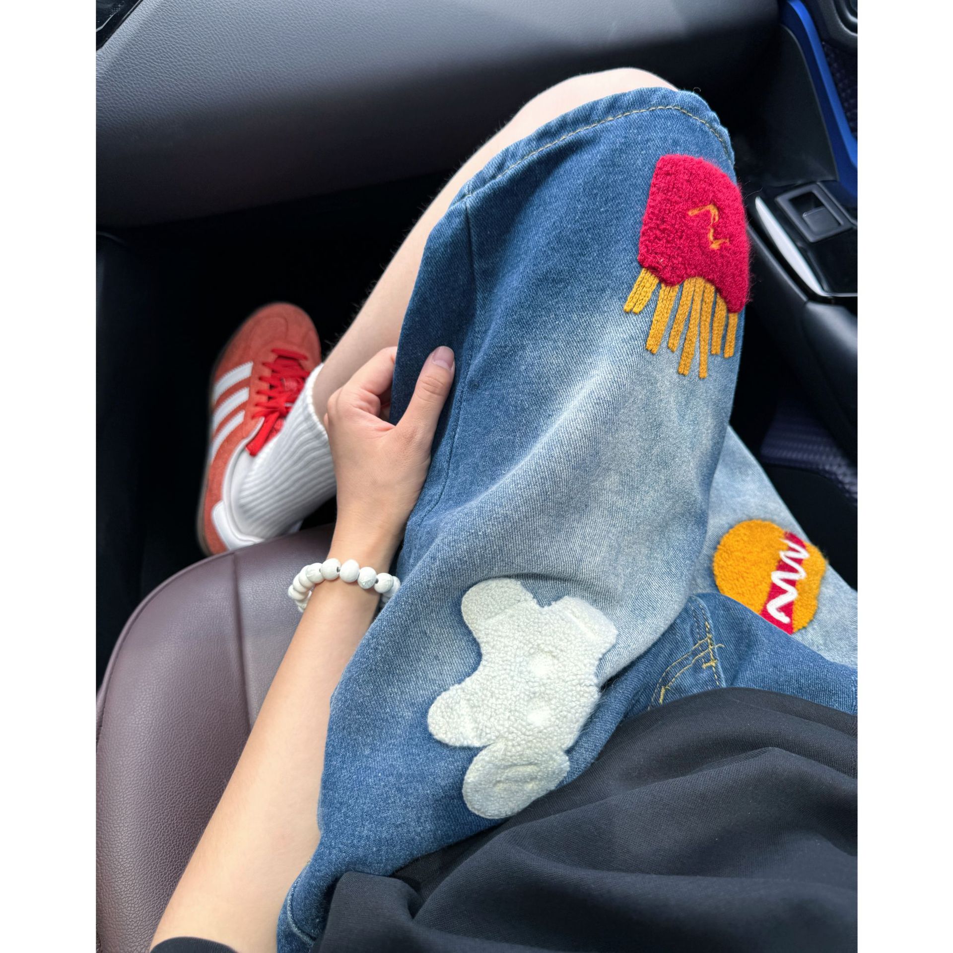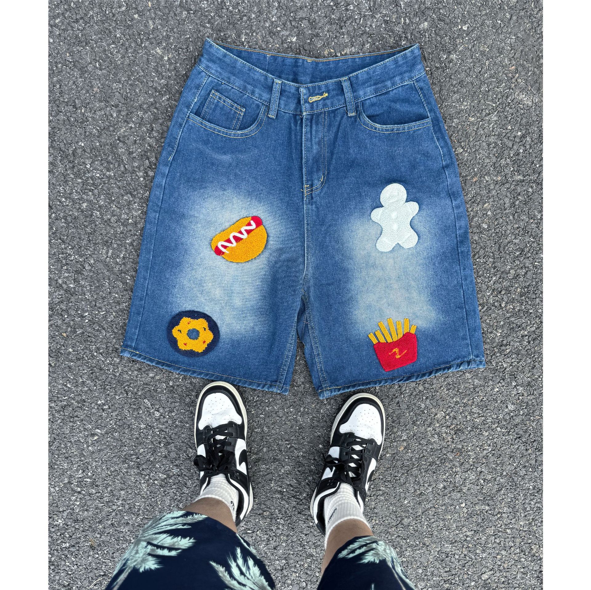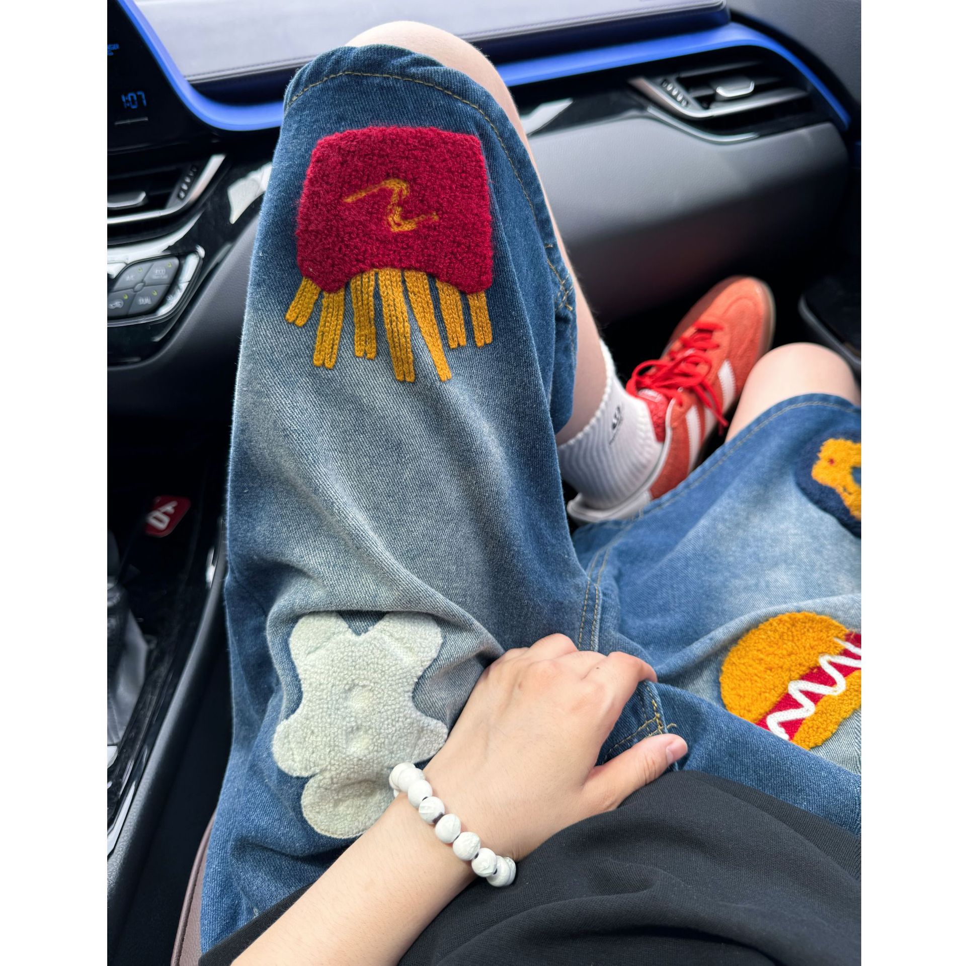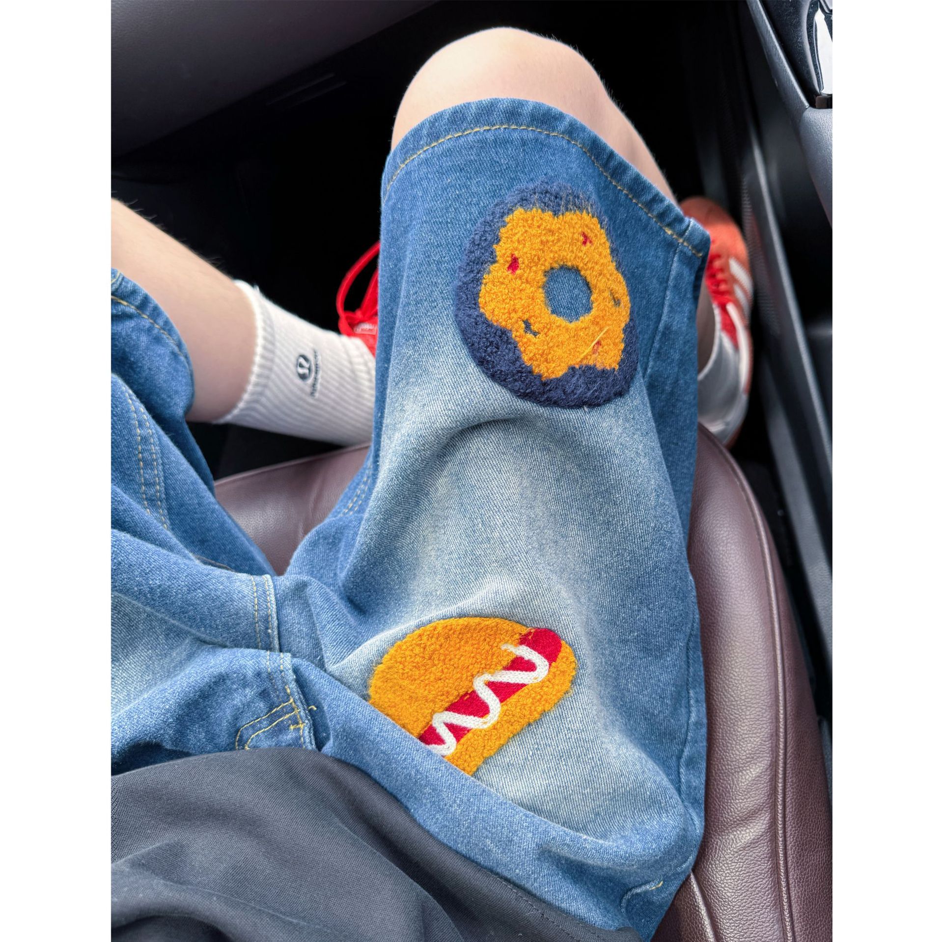 汉堡薯条趣味毛巾绣牛仔短裤男生美式高街夏季宽松直筒阔腿五分裤