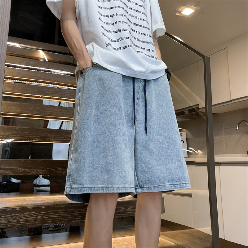 复古水洗抽绳牛仔短裤男阔腿直筒夏季宽松薄款潮牌百搭运动五分裤