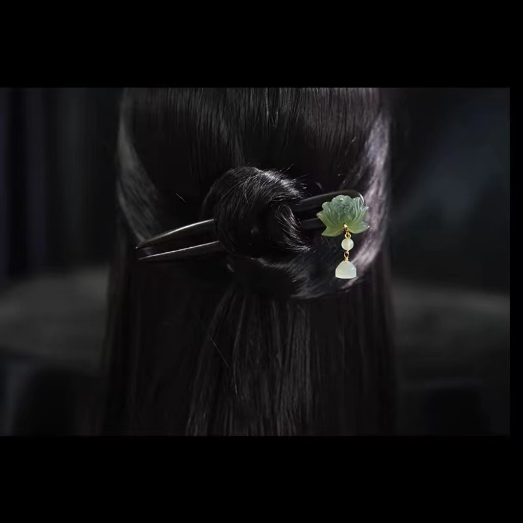 新中式原创双叉簪u型双钗木簪岫玉荷花莲蓬高级感茶服旗袍配饰女