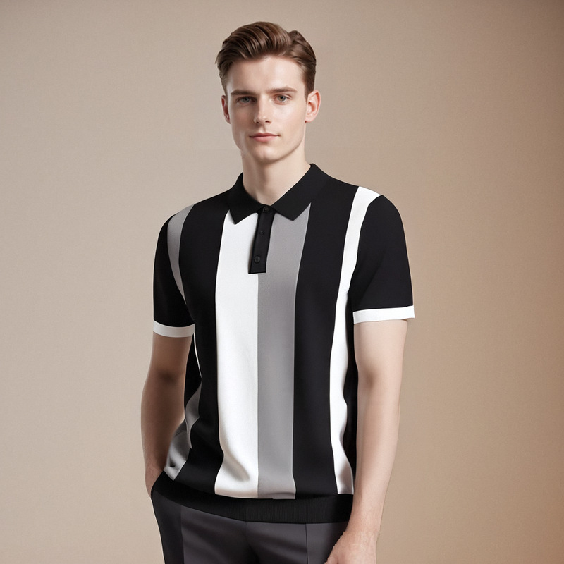 冰丝polo衫男短袖夏季2025新款高端翻领拼接条纹针织t恤修身潮流