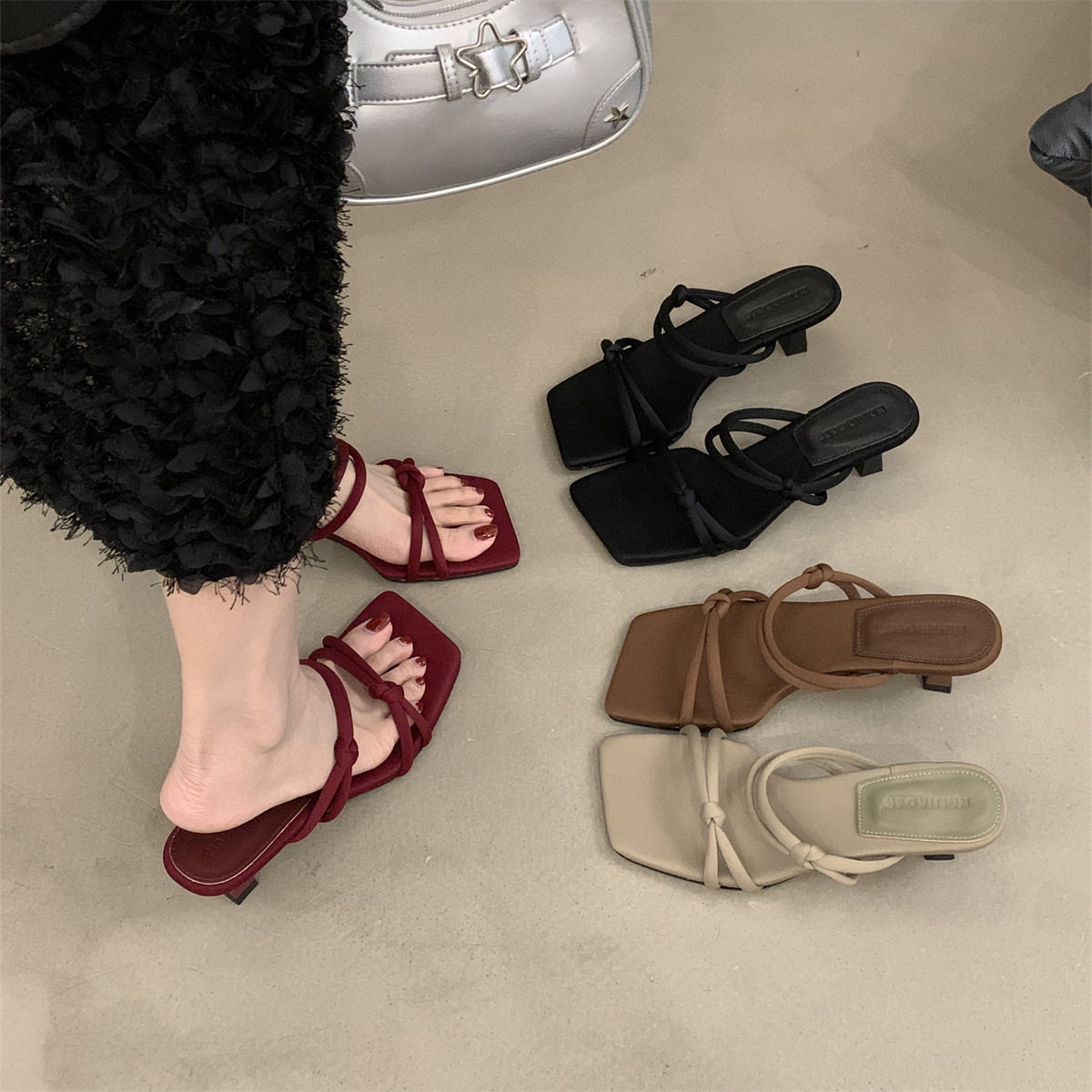 小众高级感细跟凉拖鞋外穿女鞋夏季新款方头细带高跟黑色凉鞋