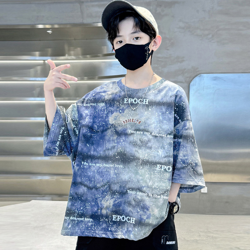 儿童装男童夏装T恤前后印花扎染新款中大童夏季短袖潮范圆领上衣
