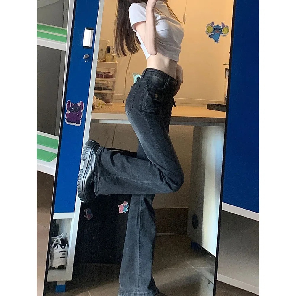 蓝灰修身拖地长裤美式多口袋小众设计微喇叭马蹄高腰弹力牛仔裤女