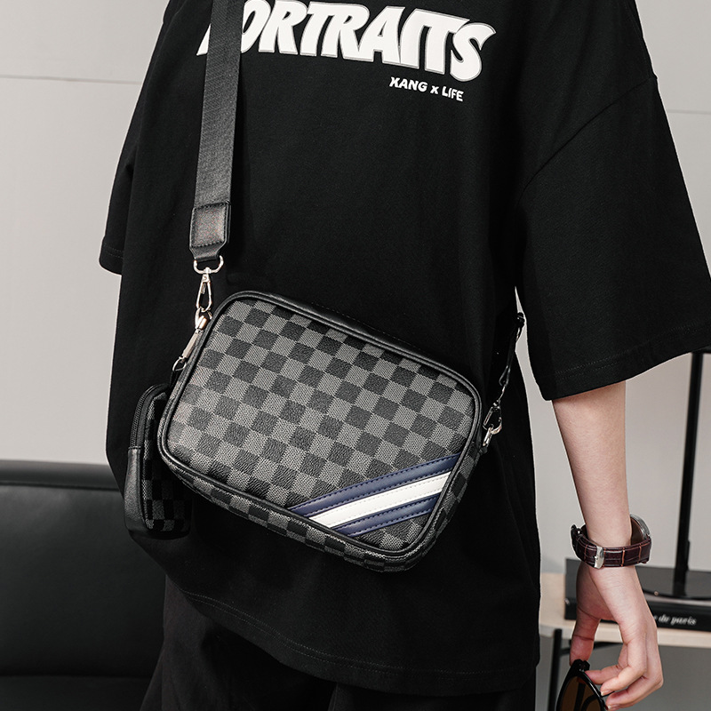 新款时尚男士小方包 经典百搭格子单肩包个性潮流子母包斜挎包