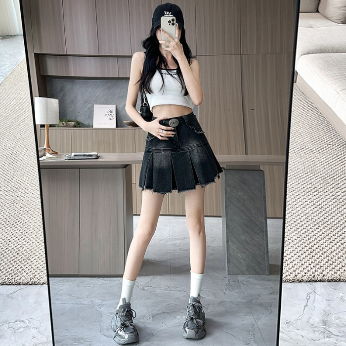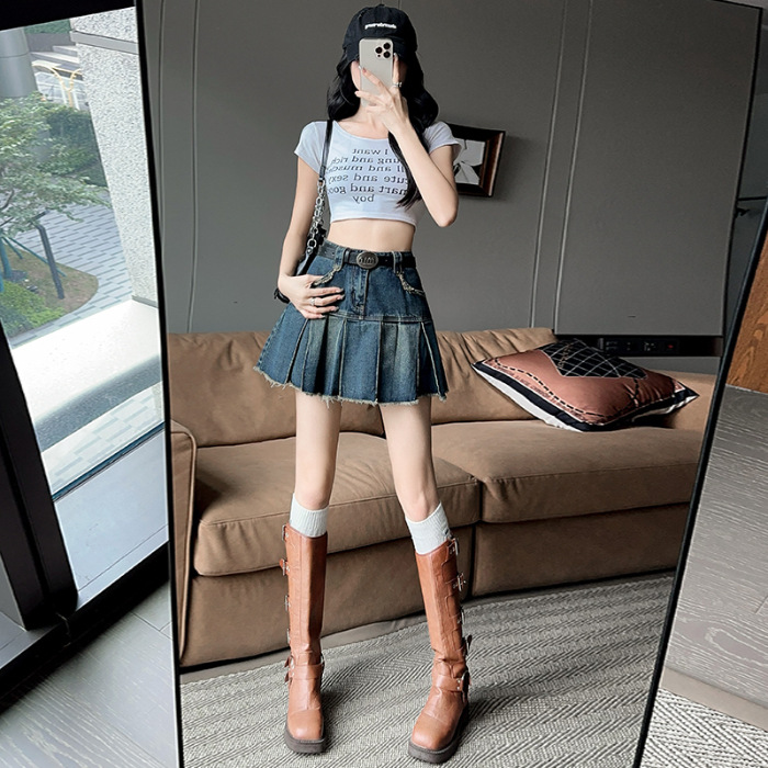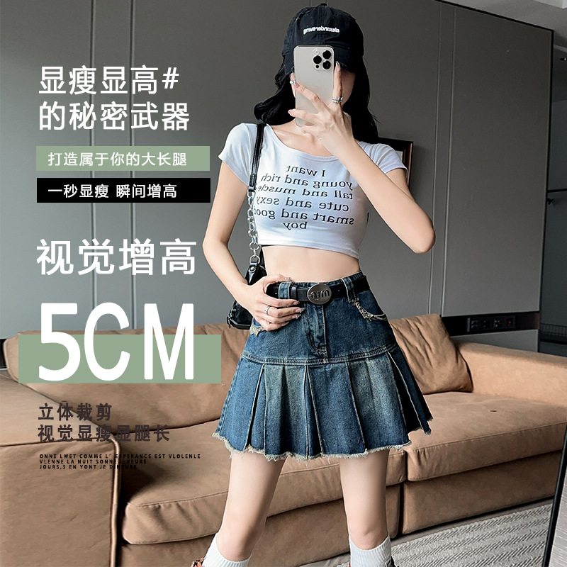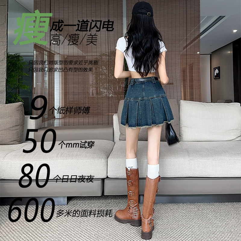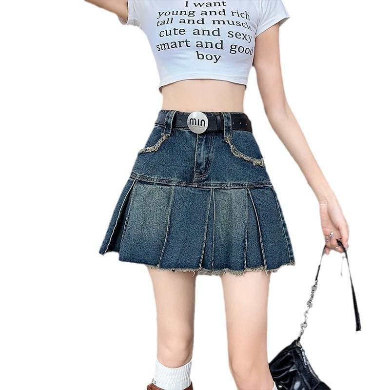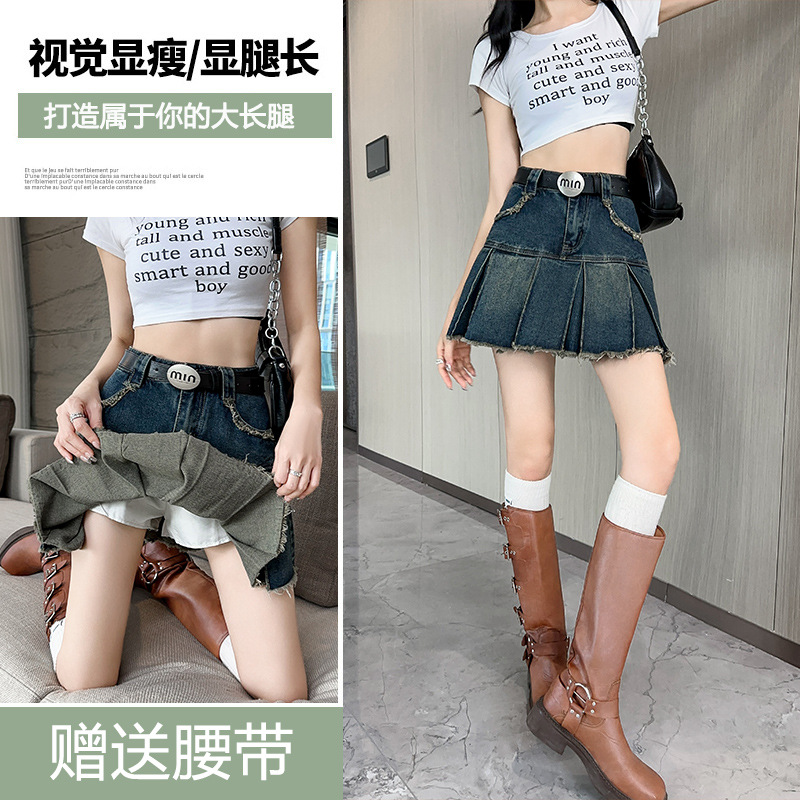 送腰带】防走光牛仔短裙女夏春季新款欧美百褶裙高腰半身裙子