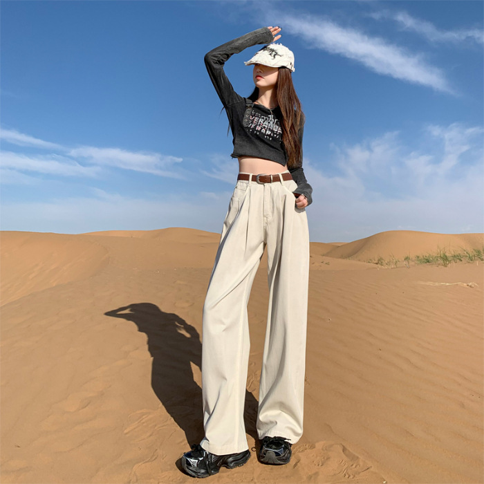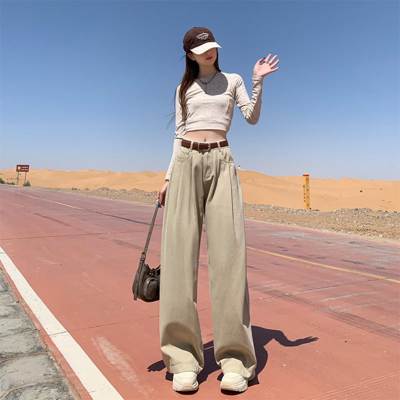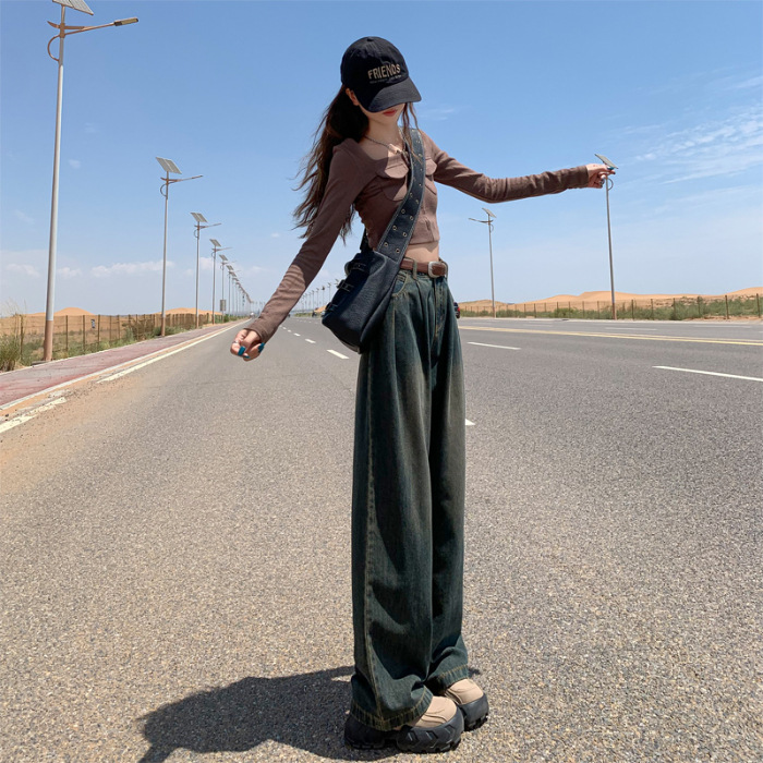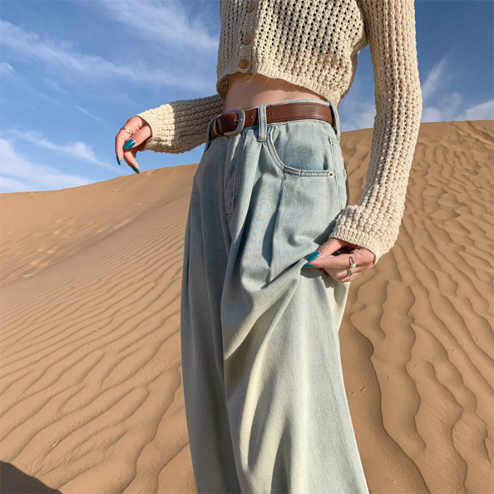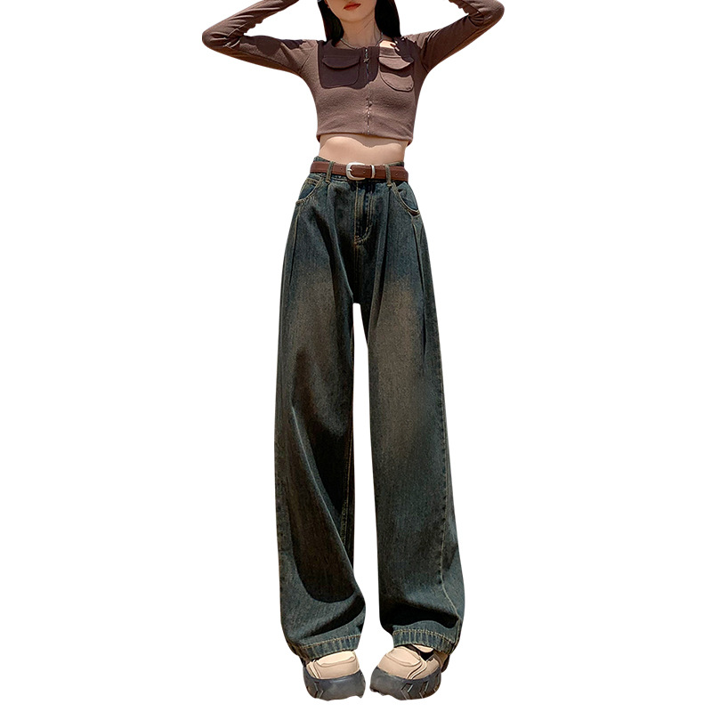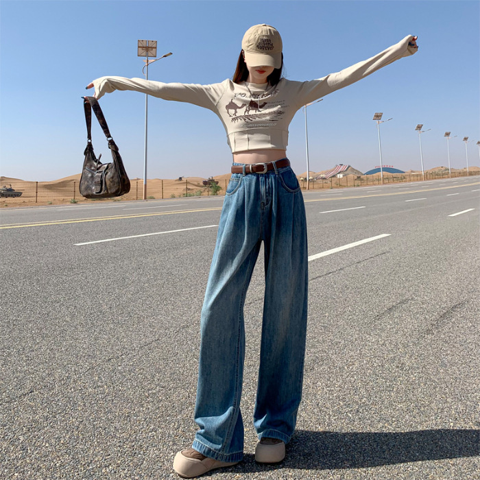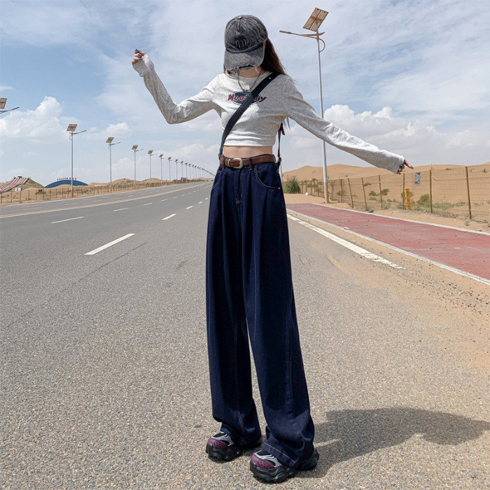 秋季韩版蓝色牛仔阔腿裤女高腰宽松显瘦褶皱设计感直筒拖地裤