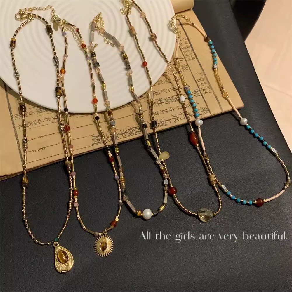 玛瑙天然石手工串珠撞色米珠珍珠叠戴项链新中式复古高级锁骨链女