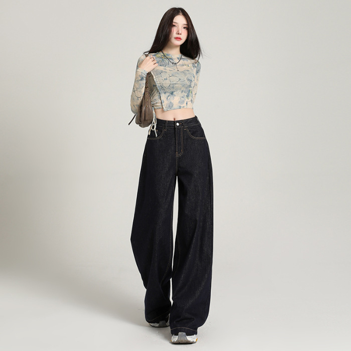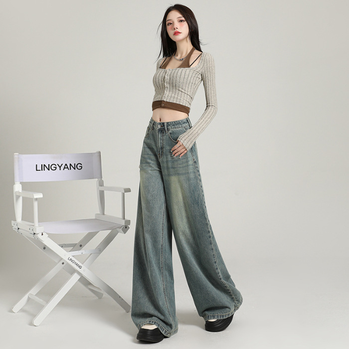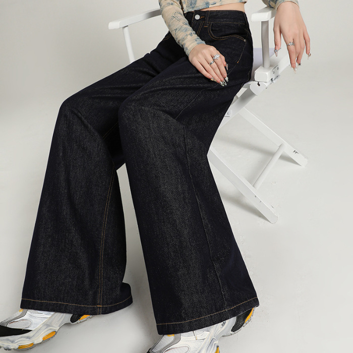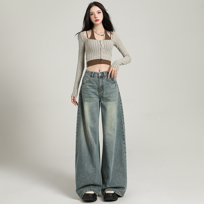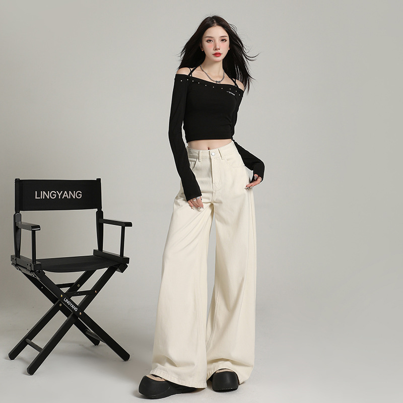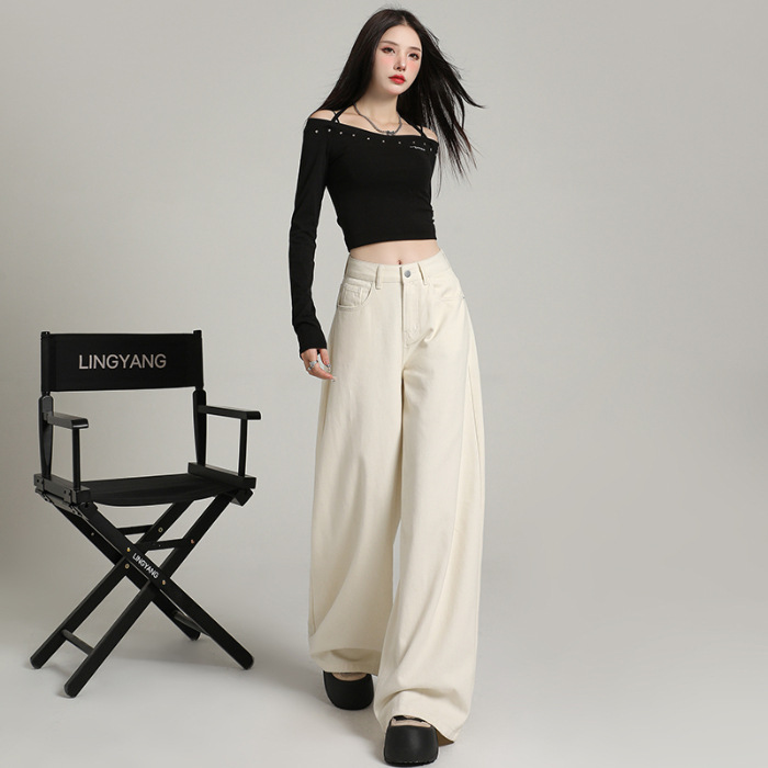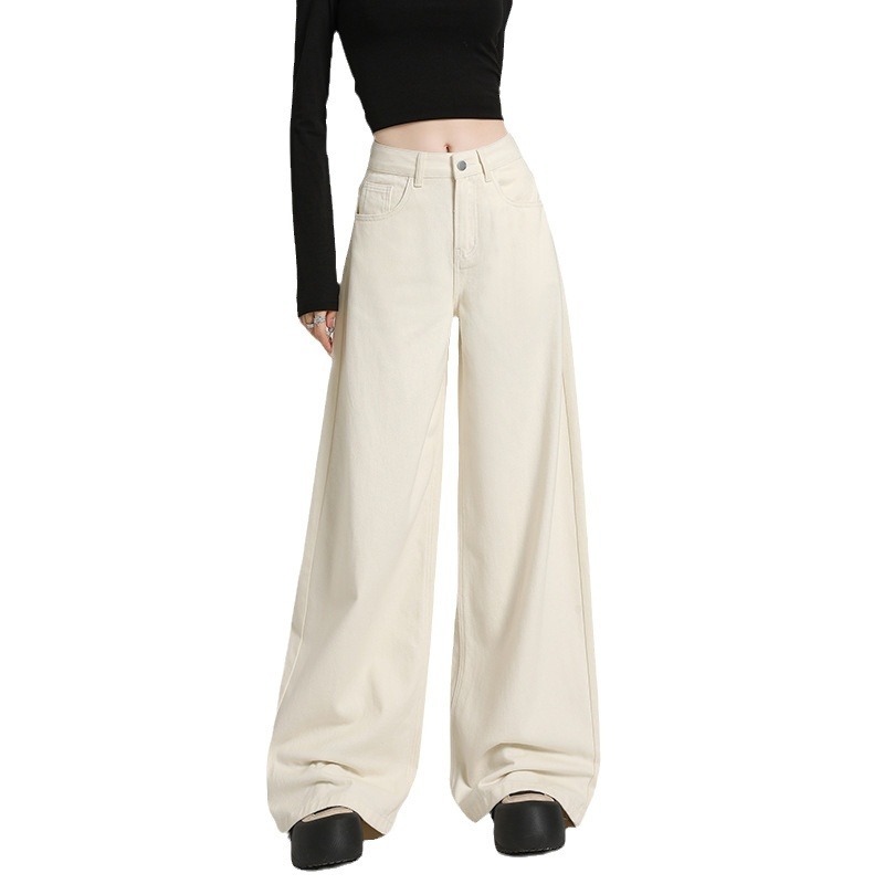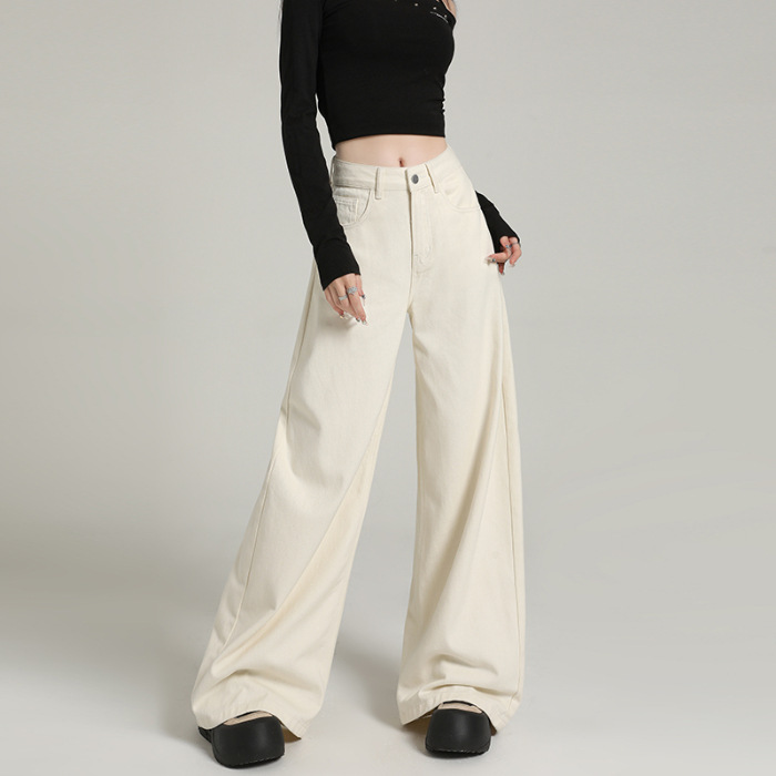 高街复古阔腿裤超柔纱双芯赛络纺软牛仔白色垂感拖地裤美式阔腿裤