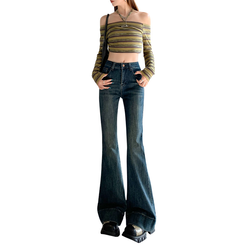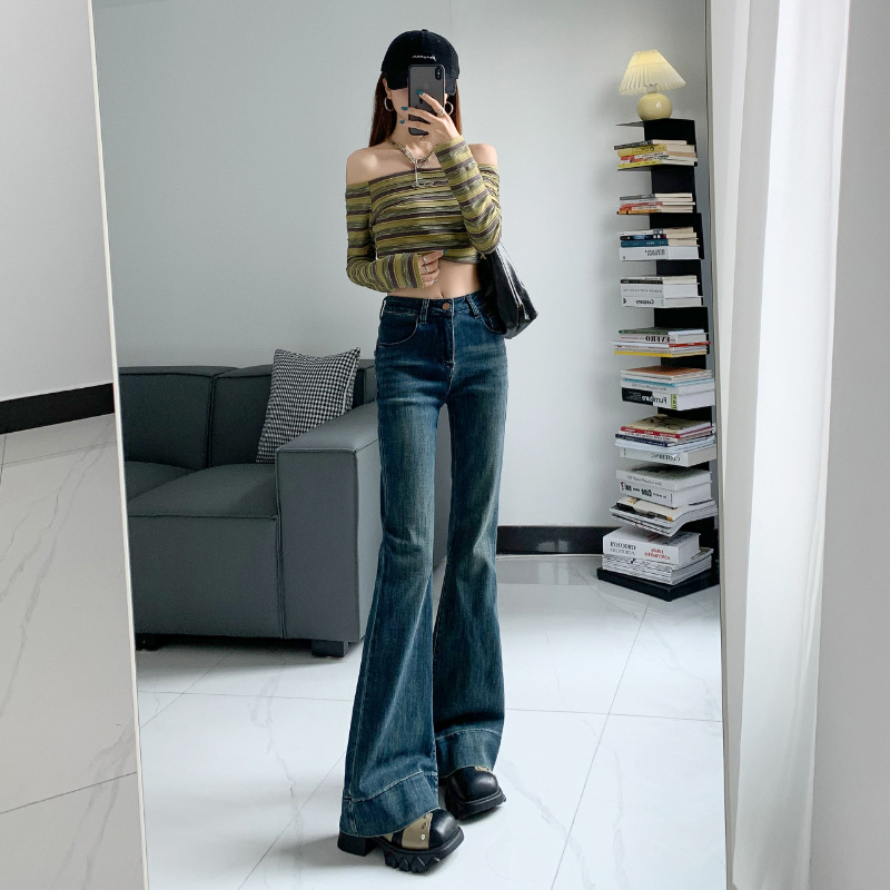 铭海复古高腰微喇牛仔裤女秋季新款修身显瘦马蹄喇叭裤子
