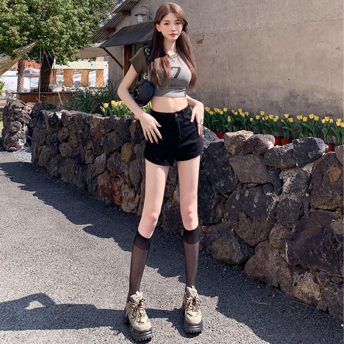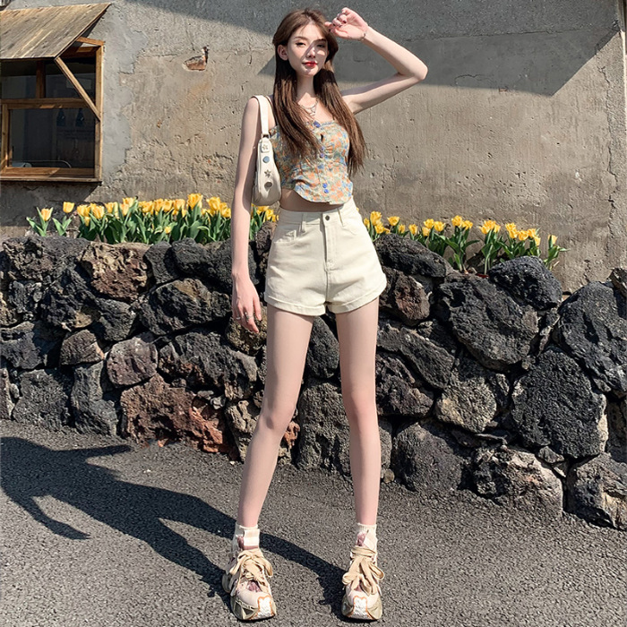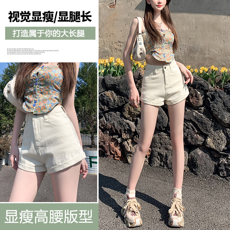 铭海米白色高腰显瘦夏季新款百搭辣妹修身超短卷边牛仔短裤女