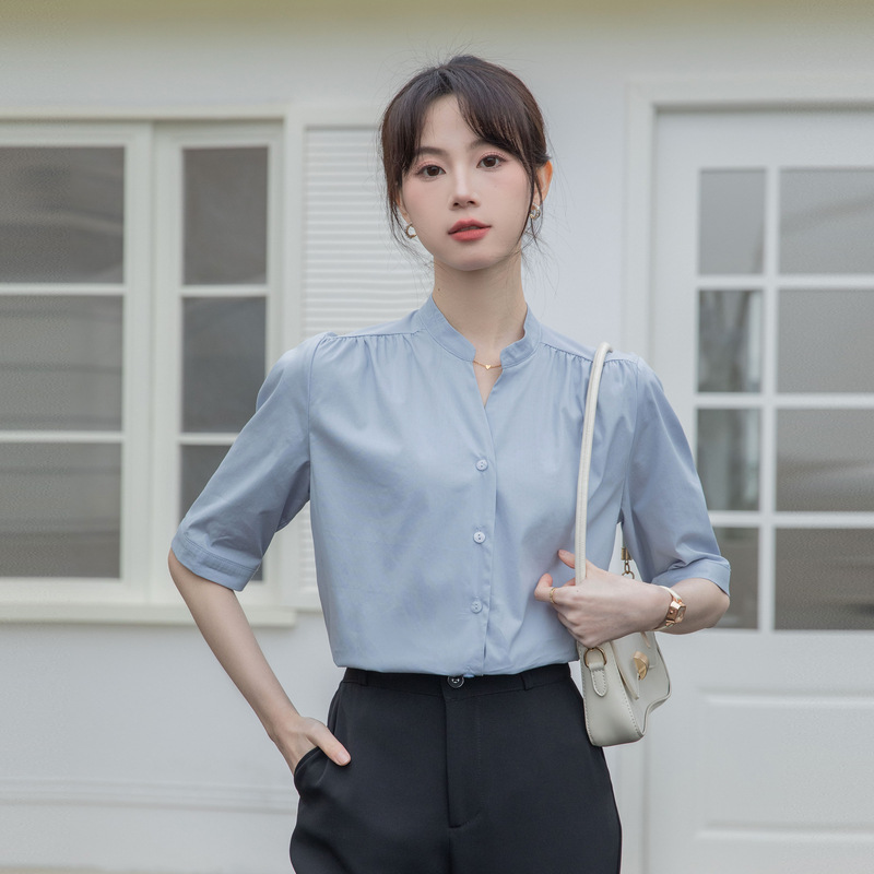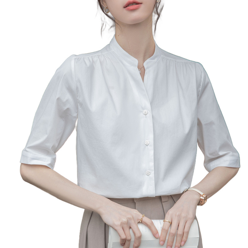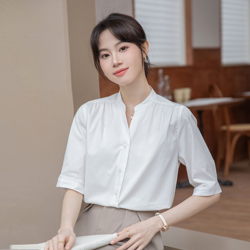 白色立领五分袖衬衫女夏季棉质V领中袖职业衬衣气质通勤面试上衣