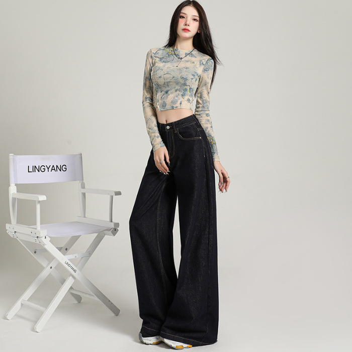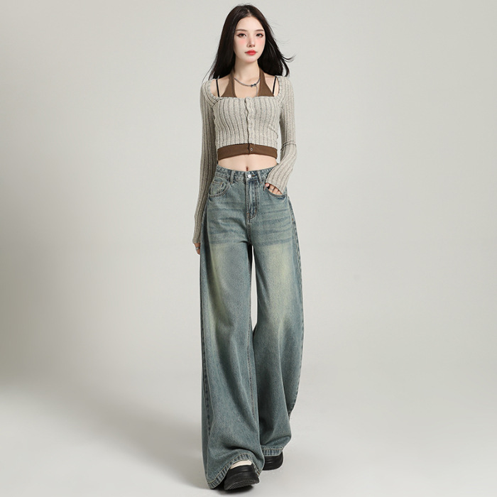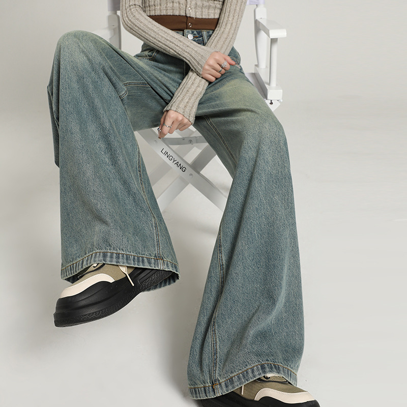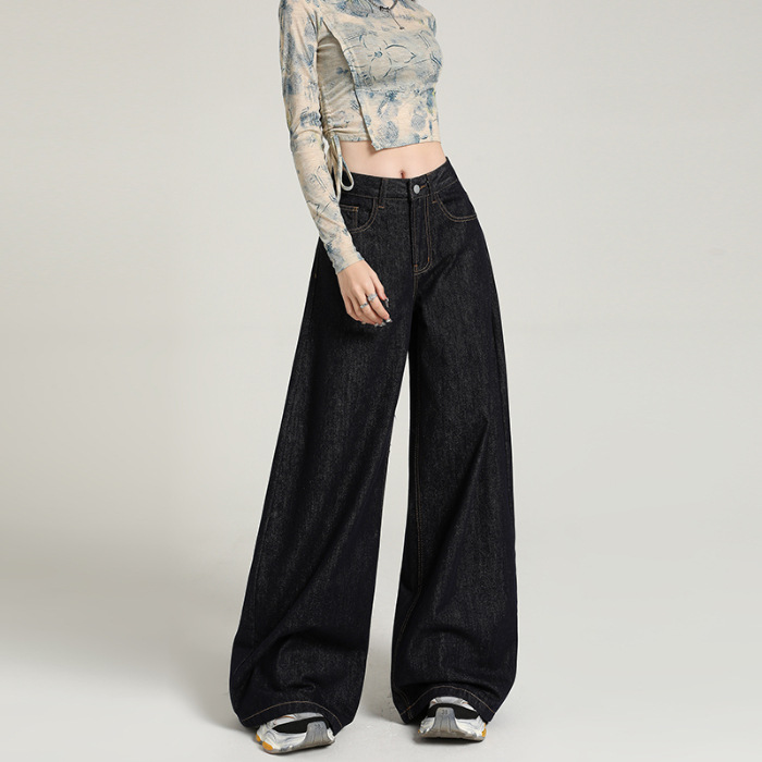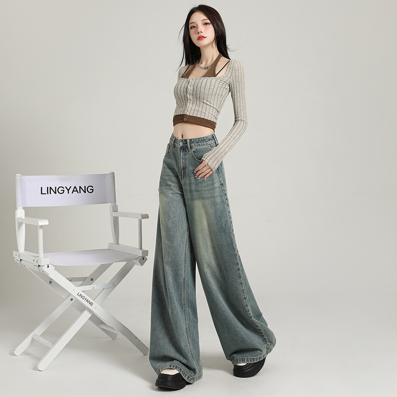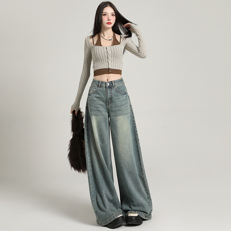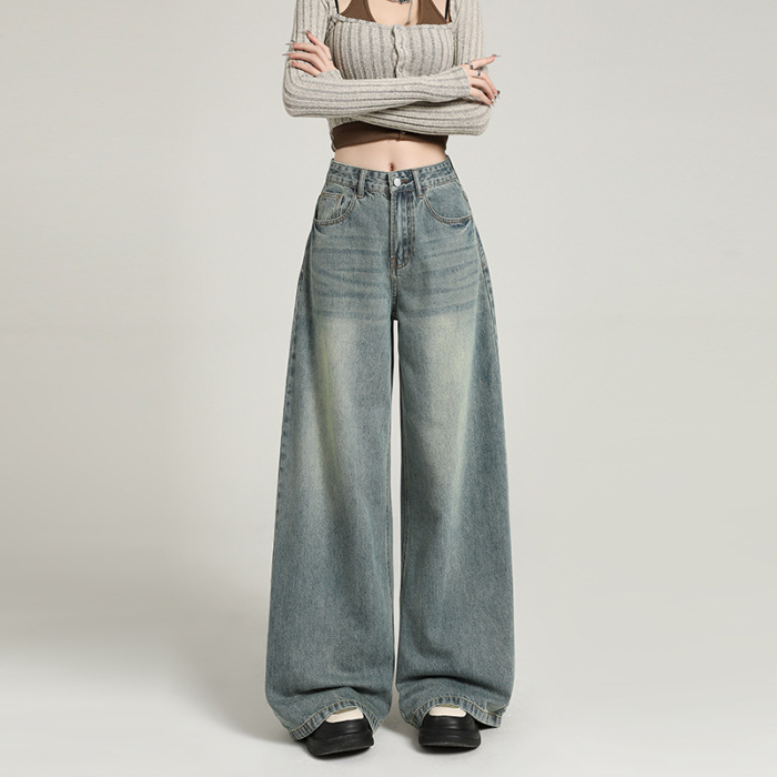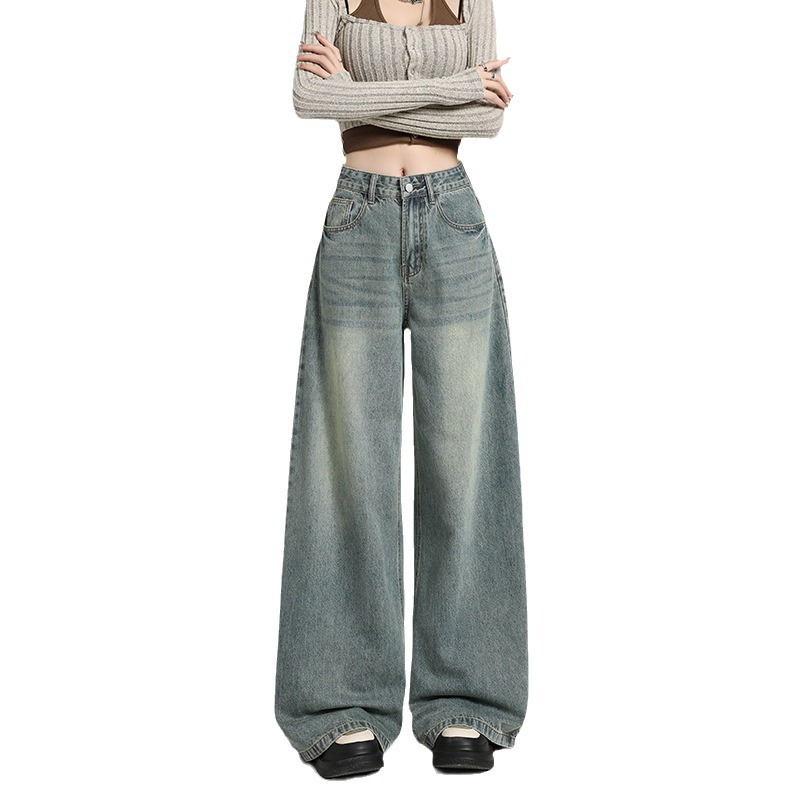 浅蓝高街复古阔腿裤超柔纱双芯赛络纺软牛仔垂感拖地裤美式阔腿裤