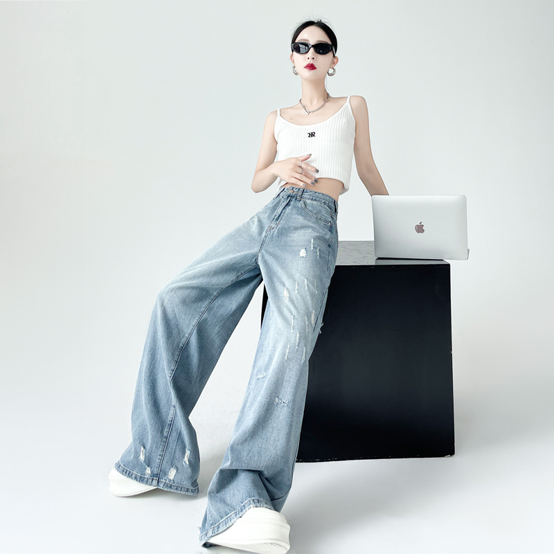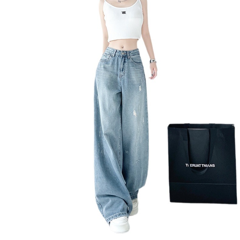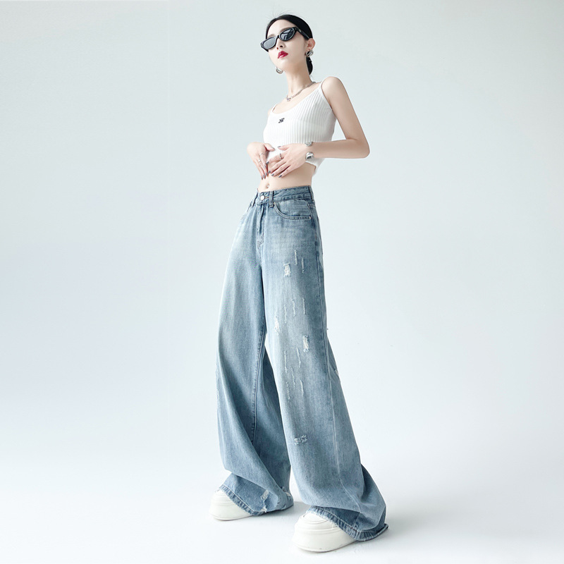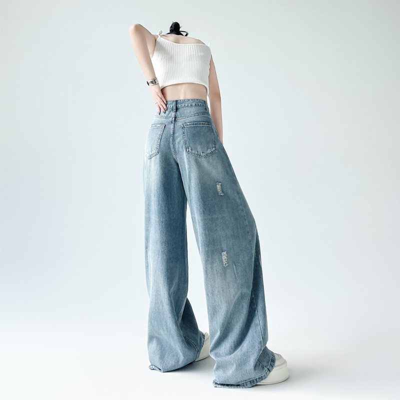 港风破洞阔腿牛仔裤女高腰年新款水洗抓痕宽松显瘦直筒拖地裤