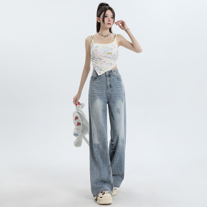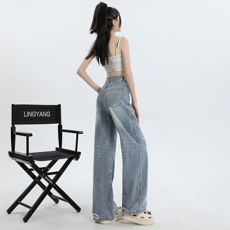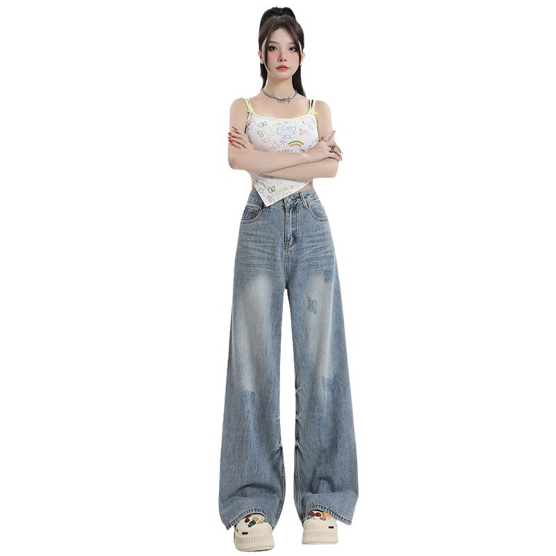 美式擦花宽松阔腿牛仔裤女夏装新款爆款高腰宽松小个子拖地裤