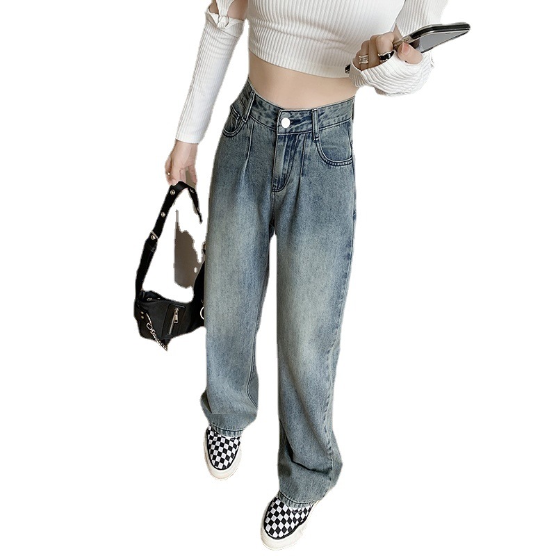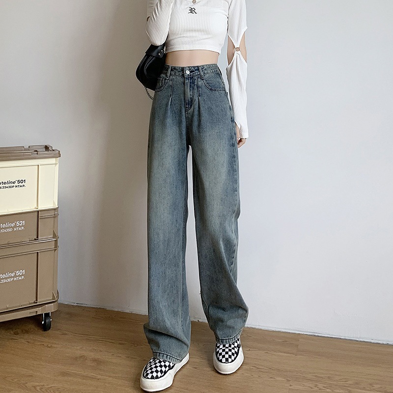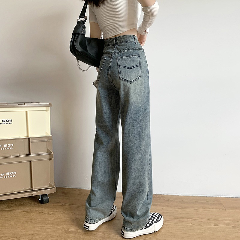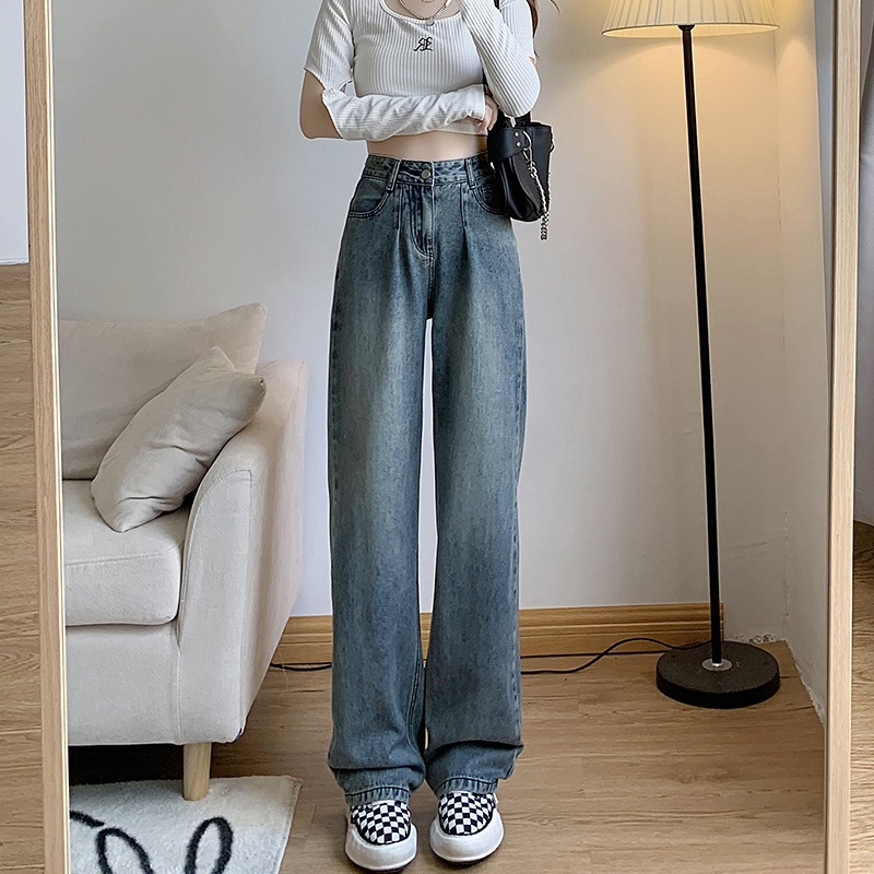 美式复古水洗高腰牛仔裤女新款直筒裤宽松显瘦阔腿拖地时髦裤