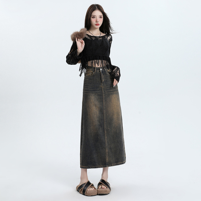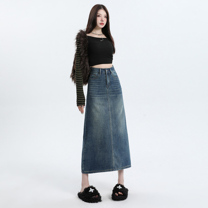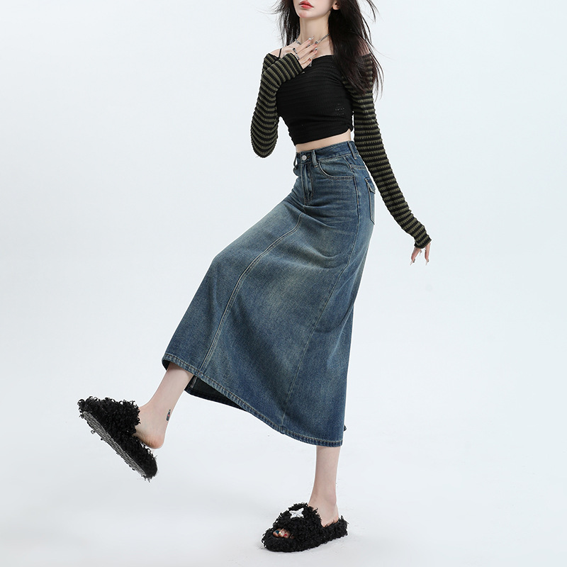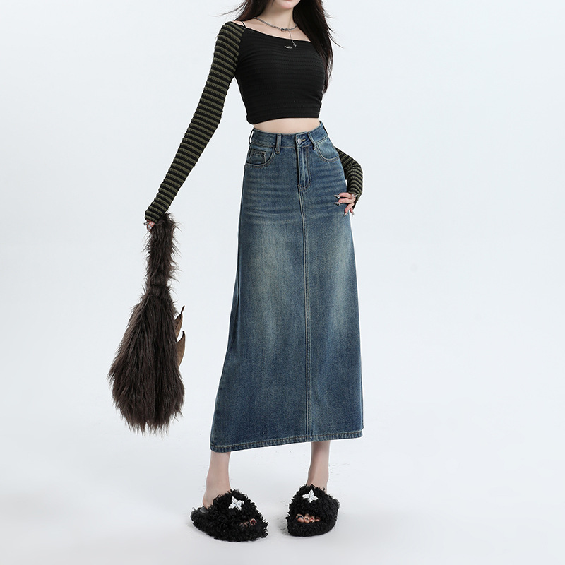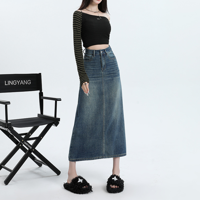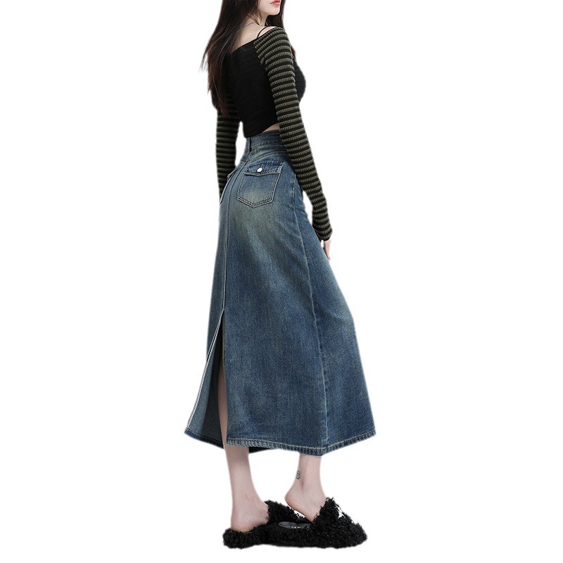 新款秋季牛仔半身裙女高腰显瘦设计感口袋开叉复古包臀中长裙