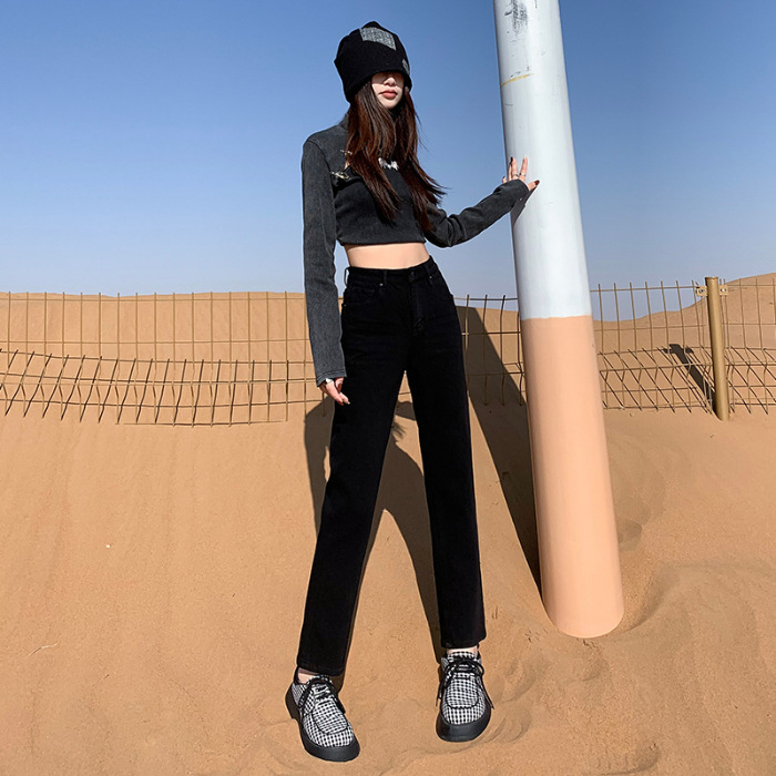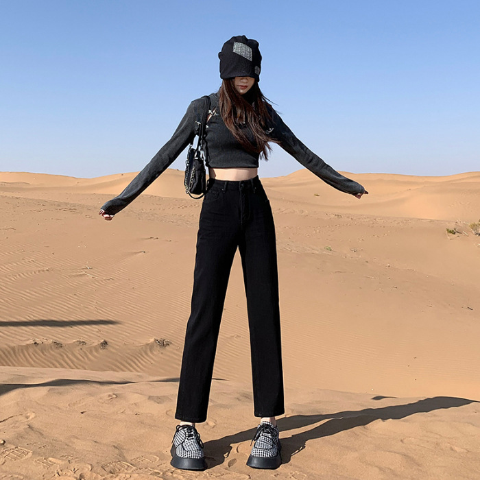 黑灰色直筒牛仔裤女春装高腰显瘦设计感宽松阔腿裤小个子拖地个性