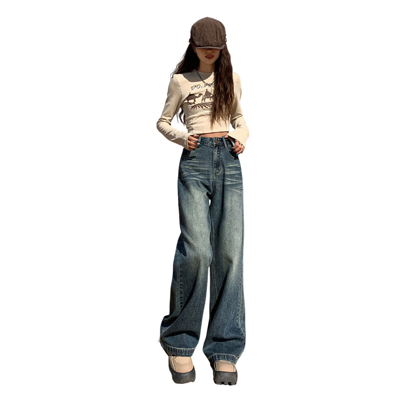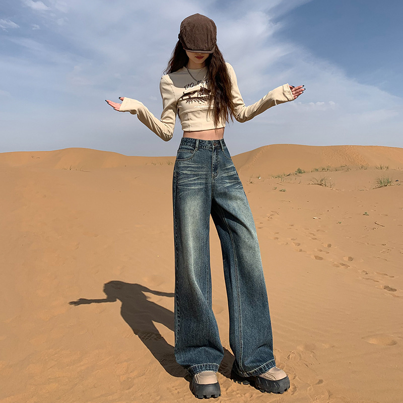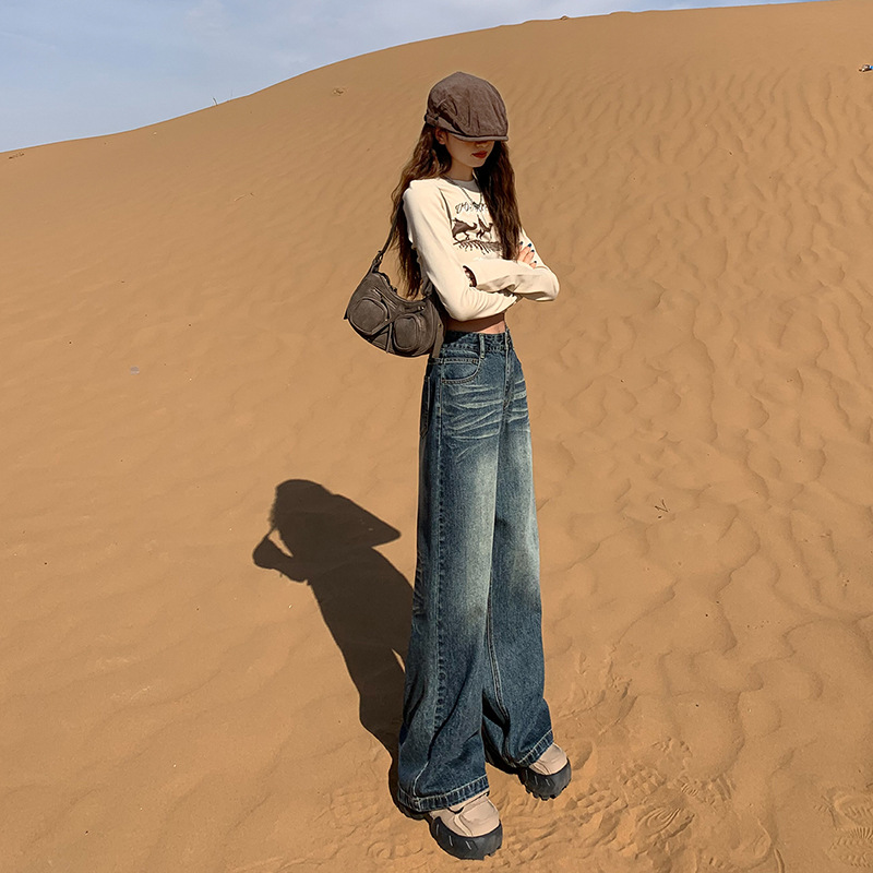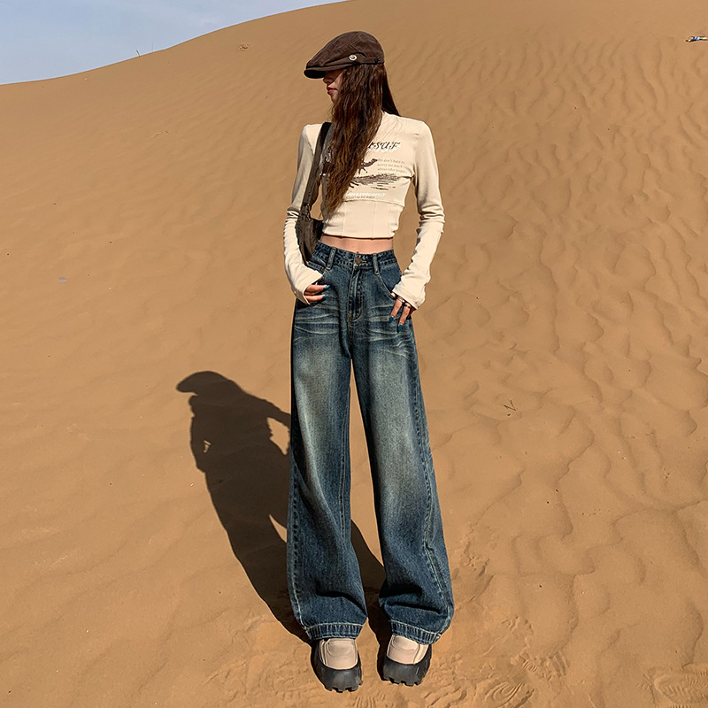 复古蓝牛仔阔腿裤女早秋新款设计感皮牌撞色后袋裤子