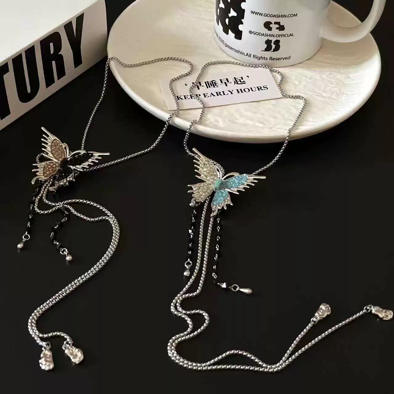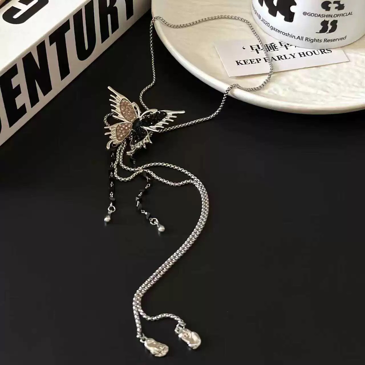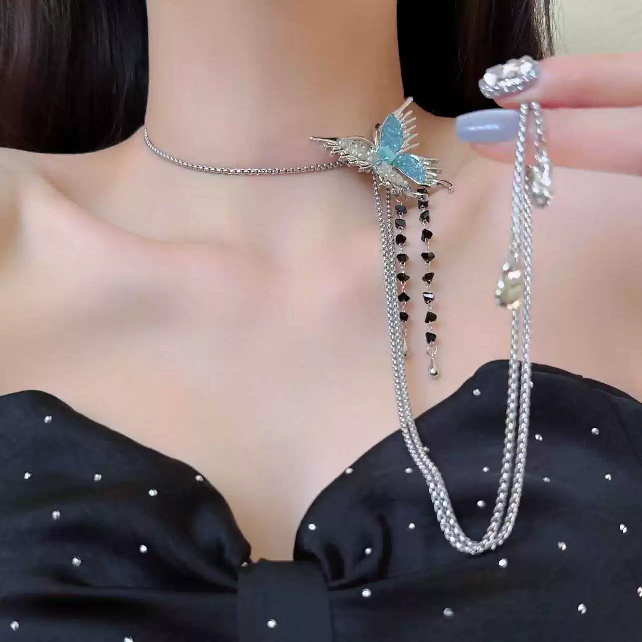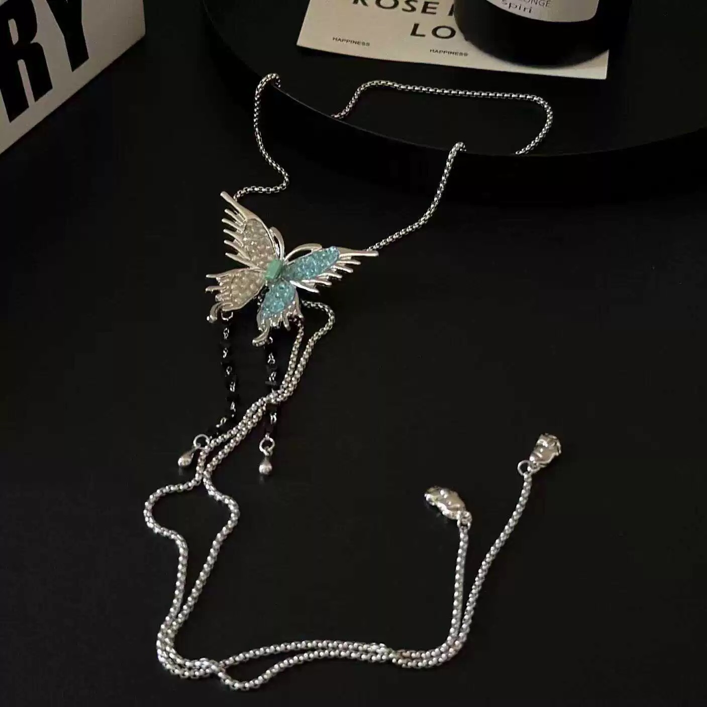 新款辣妹可抽拉撞色水钻蝴蝶流苏项链女轻奢小众时尚气质锁骨链