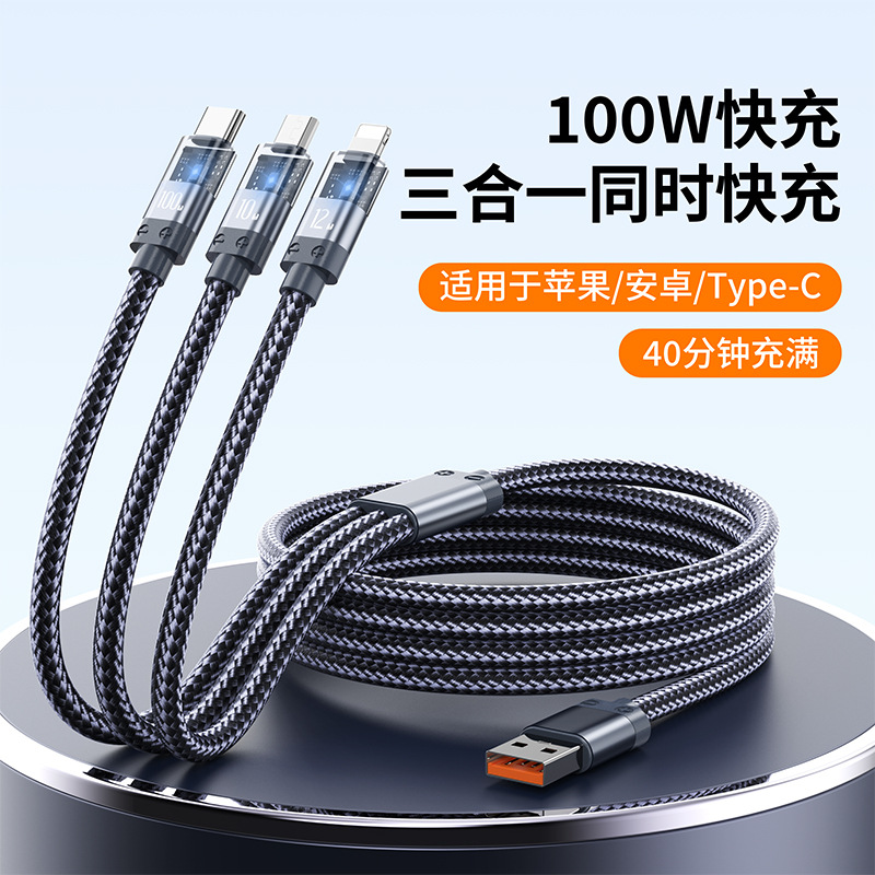 100W超级快充三合一数据线一拖三充电线带灯适用苹果华为安卓车载