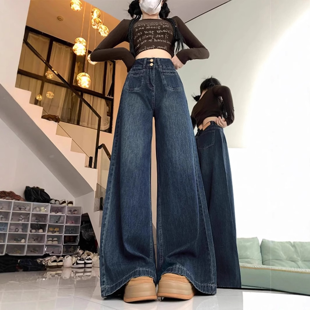 复古深蓝色阔腿牛仔裤女春秋新款高腰显瘦垂感宽松大裤脚拖地裤裙