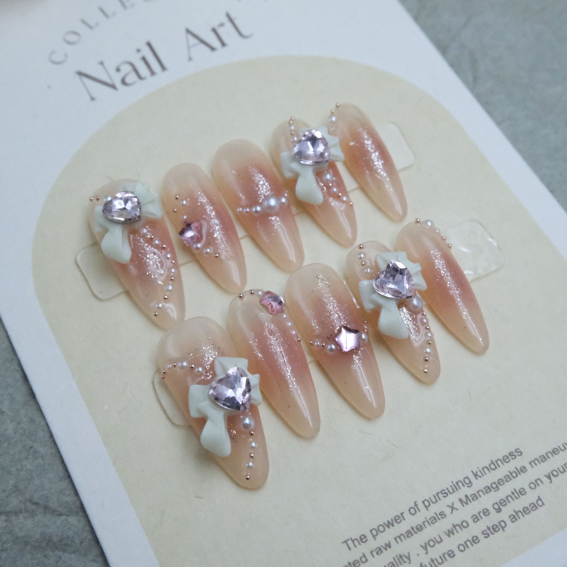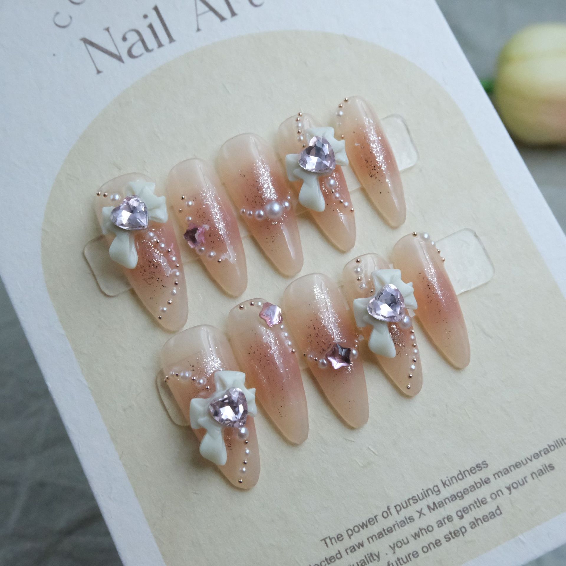 纯手工美甲穿戴甲指甲贴高级轻奢腮红闪钻蝴蝶结冰透裸色珍珠闪粉