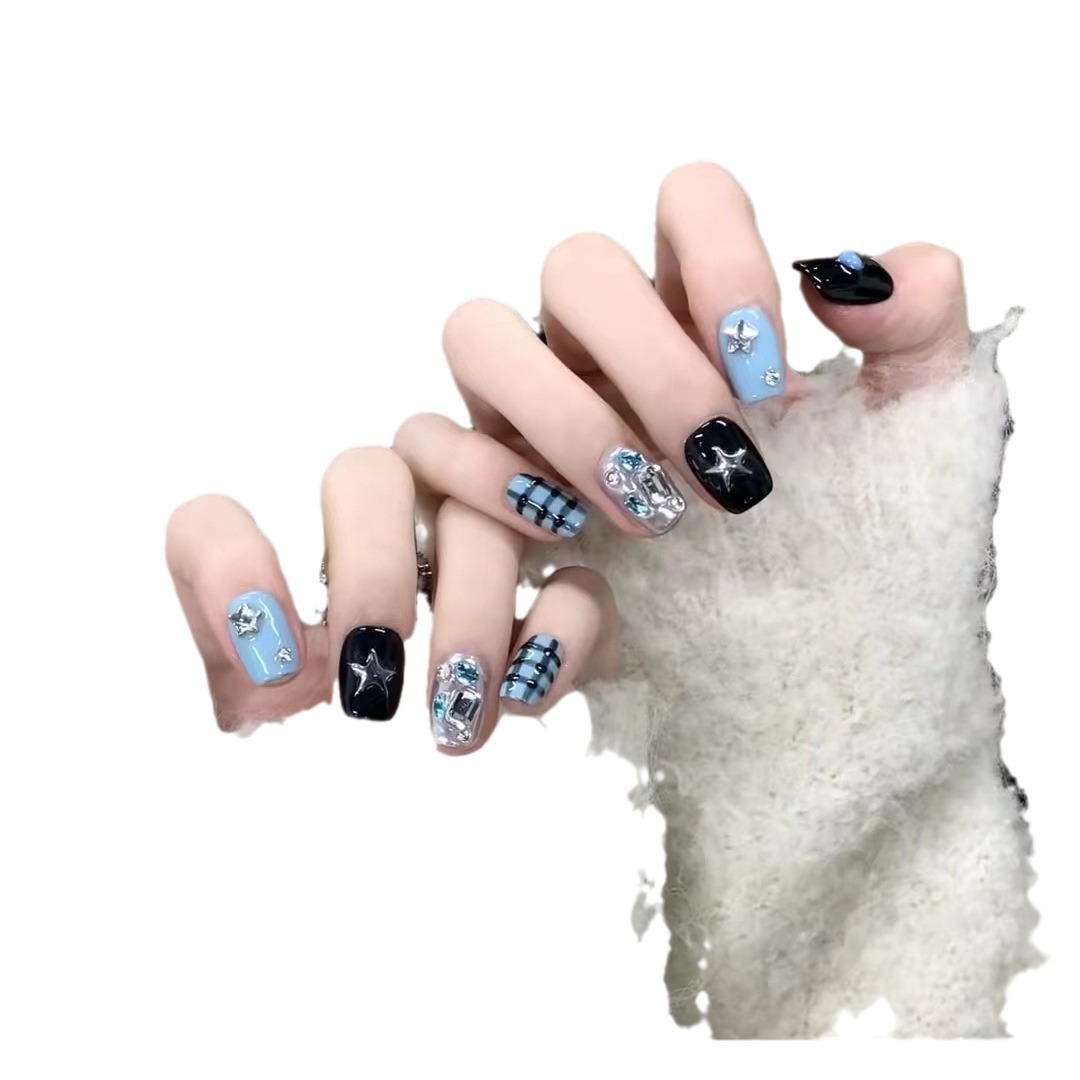 辣妹纯手工穿戴甲黑色亮片爆闪可拆卸美甲贴片学生美甲片成品批发
