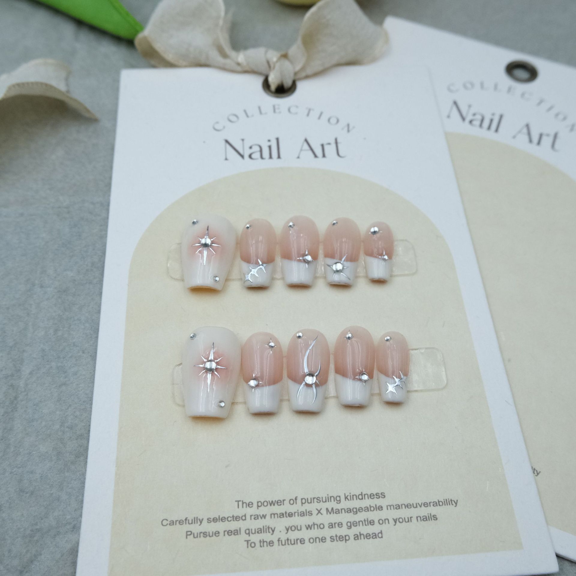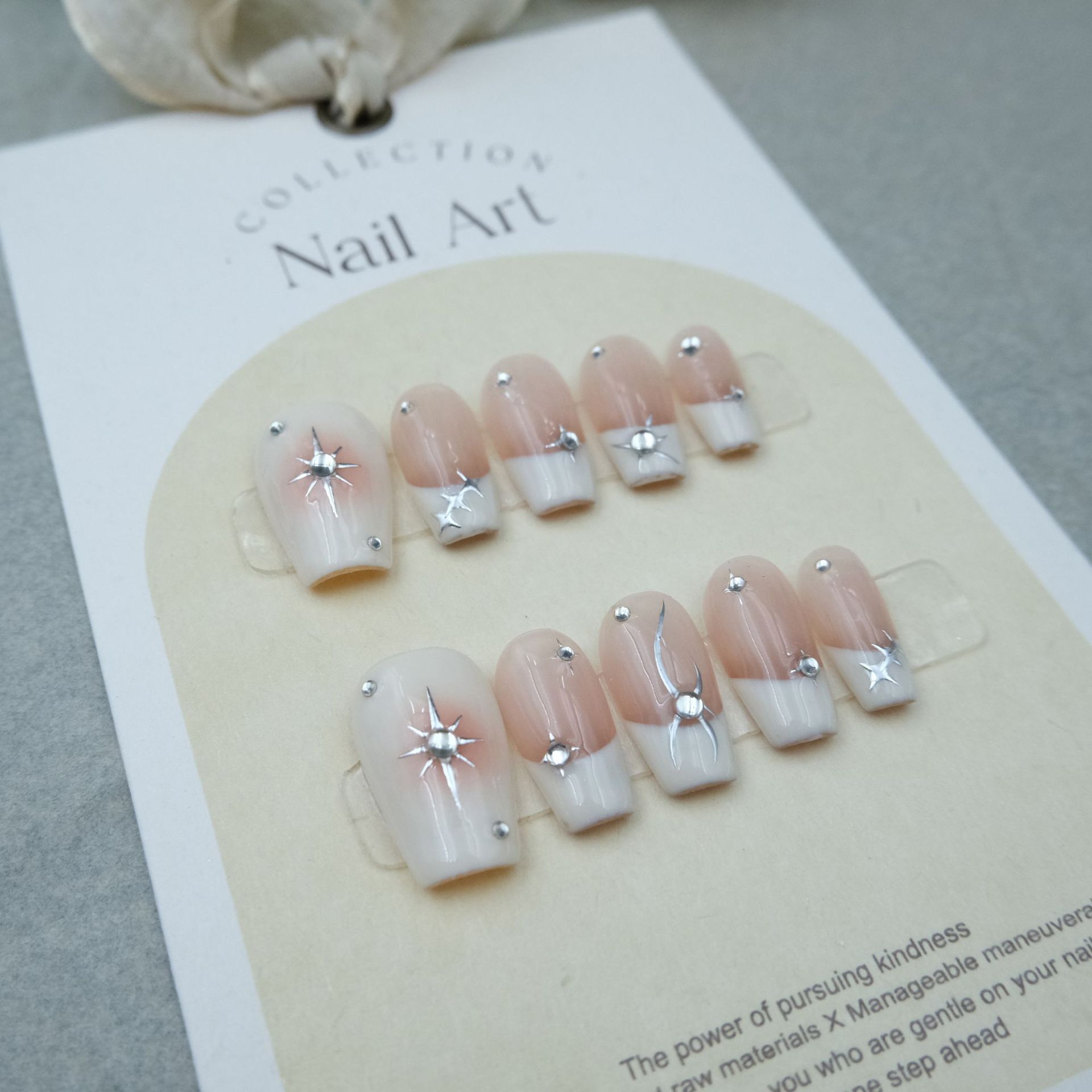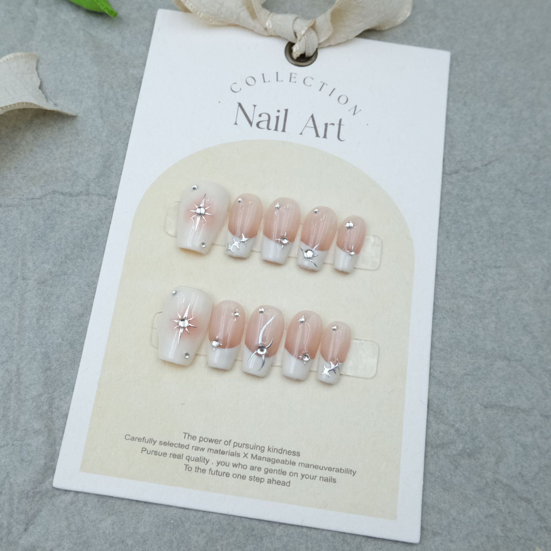 手工美甲穿戴甲指甲贴高级裸色奶白法式镶钻四芒星辣妹小红书同款