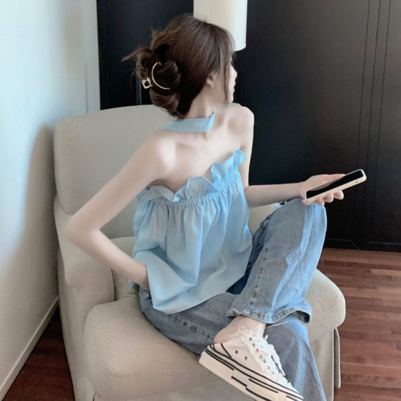 一字肩上衣设计感女夏季新款设计感小众木耳边吊带背心女外穿