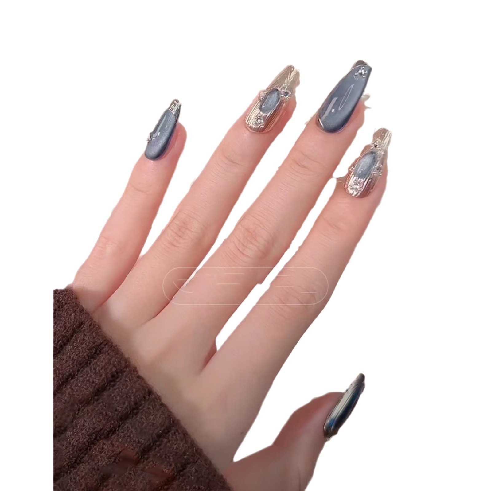 实拍穿戴甲纯手工美甲成品假指甲贴片蓝色灯泡猫眼布契拉抖音爆款