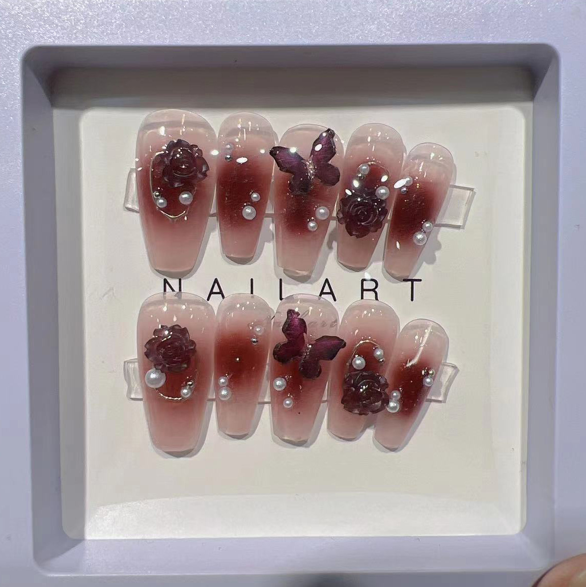 纯手工美甲穿戴甲新款乌梅子酱蝴蝶小花晕染美甲小红书可拆卸