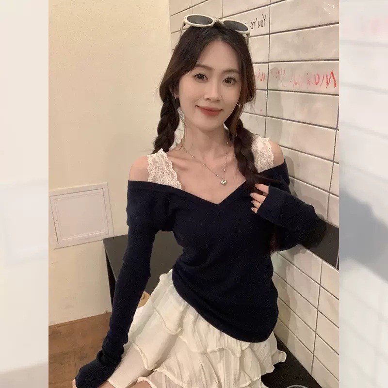 假两件纯欲风露肩长袖恤女2025新款爆款蕾丝拼修身显瘦打底衫上衣