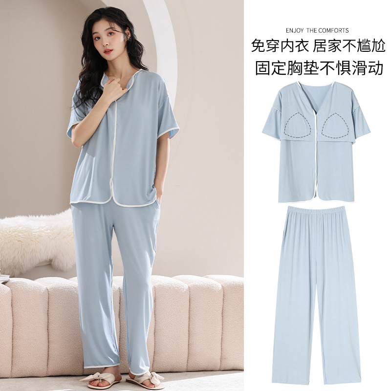 带胸垫睡衣女夏季短袖长裤新款简约圆领莫代尔凉感家居服夏天
