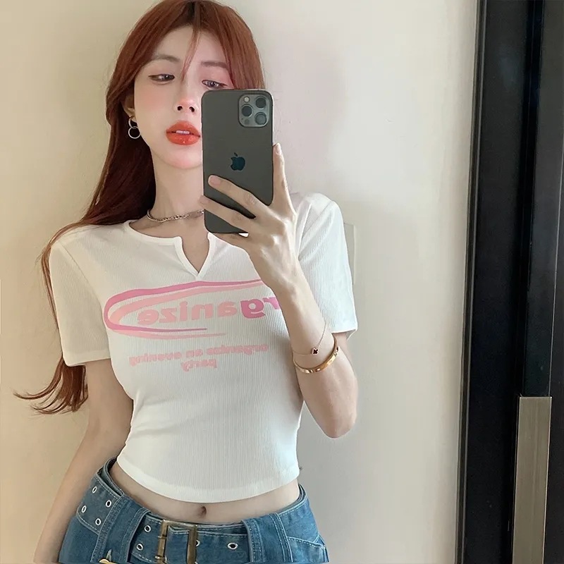 短袖修身V领字母印花短款露脐显瘦内搭ins洋气T恤上衣夏季女新款