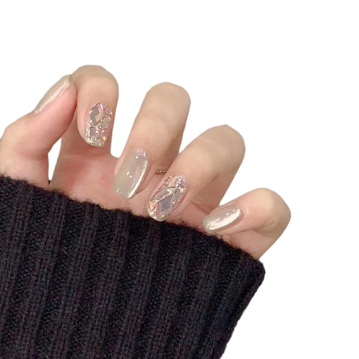 实拍穿戴甲纯手工美甲成品假指甲贴片高级裸色猫眼粉色爆闪极光钻