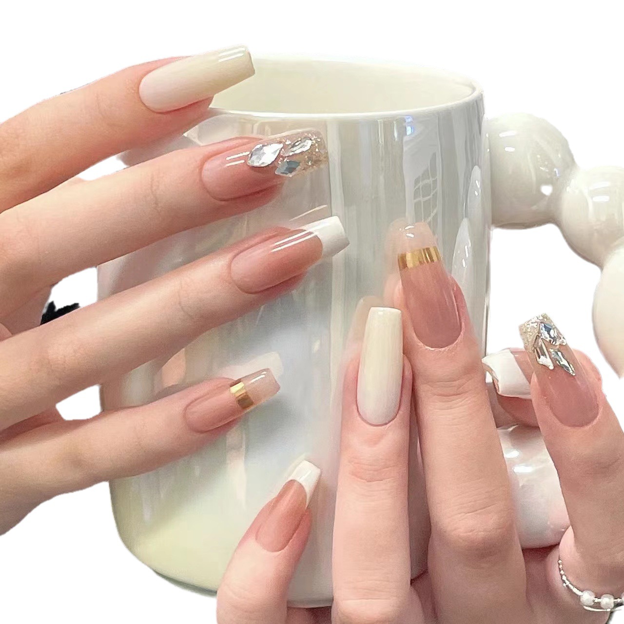 黛瑞森纯手工美甲穿戴甲假指甲贴片温柔高级奶白法式金色魔镜闪粉