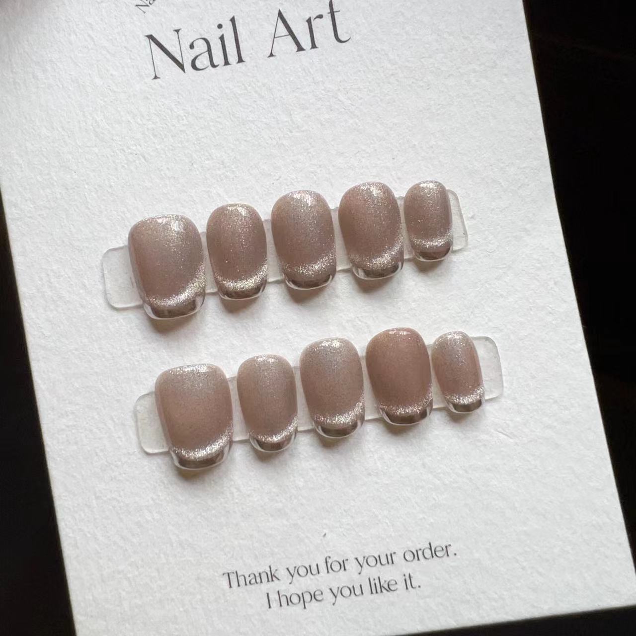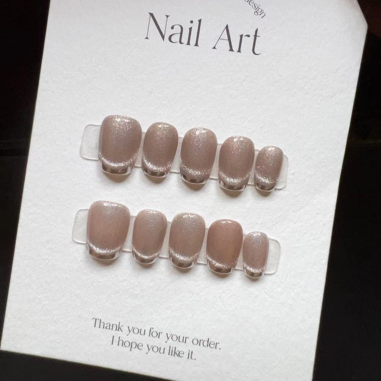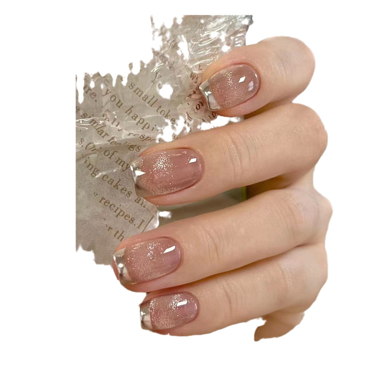 手工美甲穿戴甲假指甲贴片秋冬新款日系猫眼法式银色魔镜学生短甲