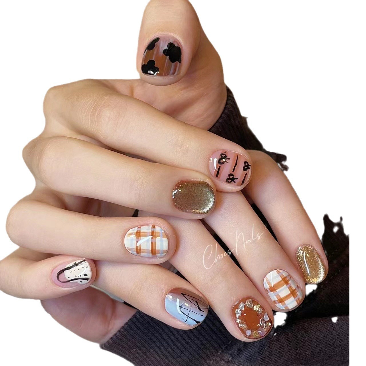 穿戴甲纯手工美甲成品假指甲贴片秋冬新款焦糖咖色手绘格子美甲