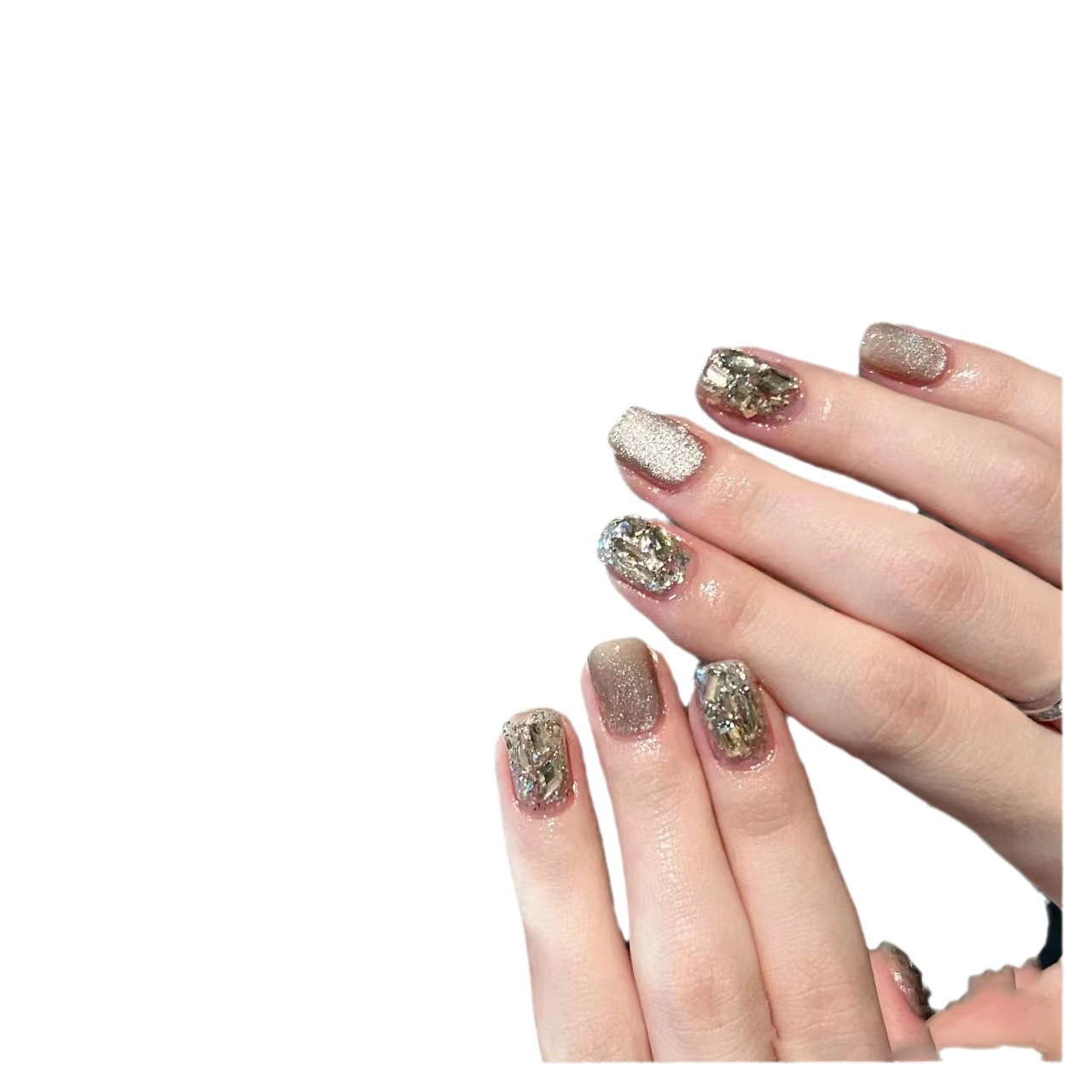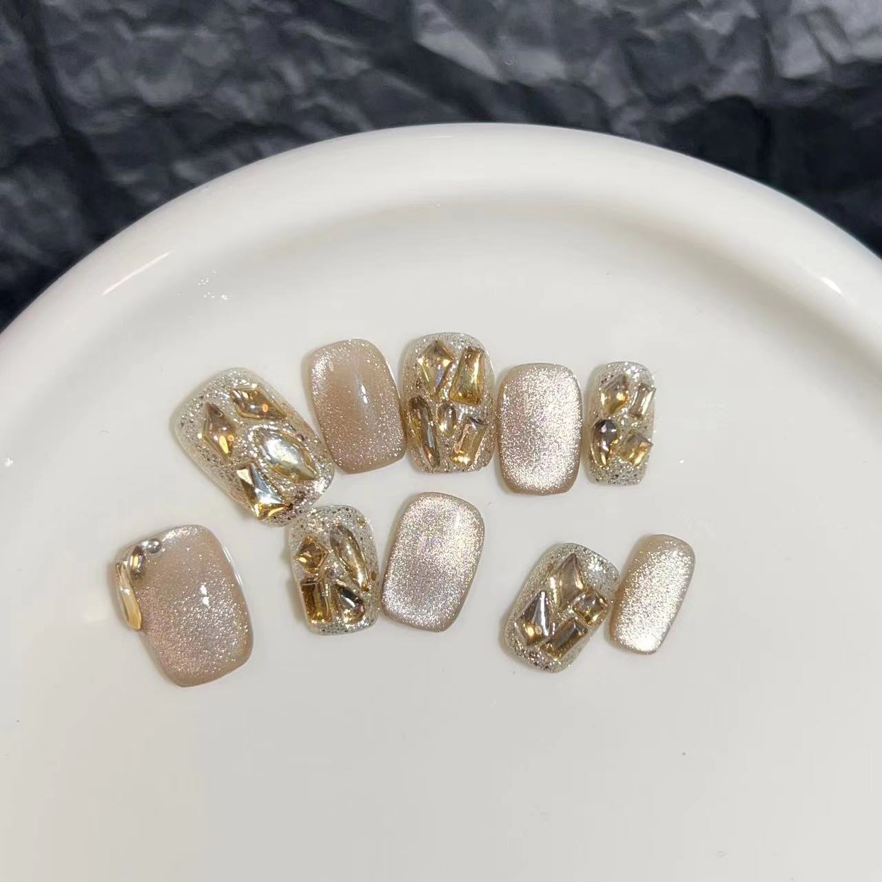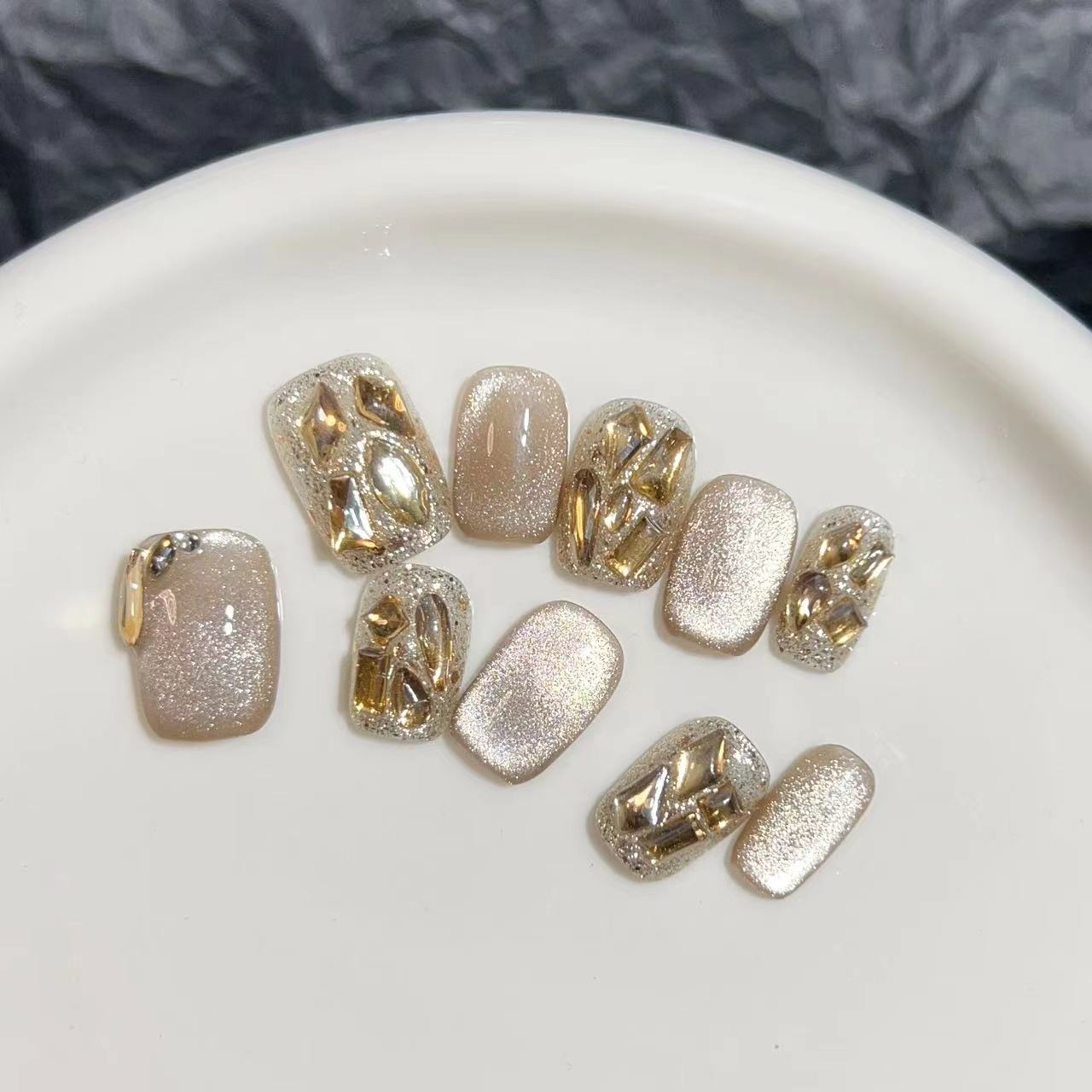 实拍穿戴甲纯手工美甲成品假指甲贴片高光灯泡猫眼爆闪香槟钻短甲