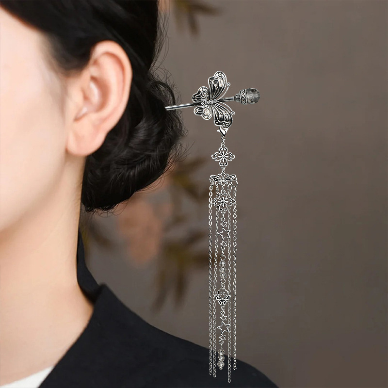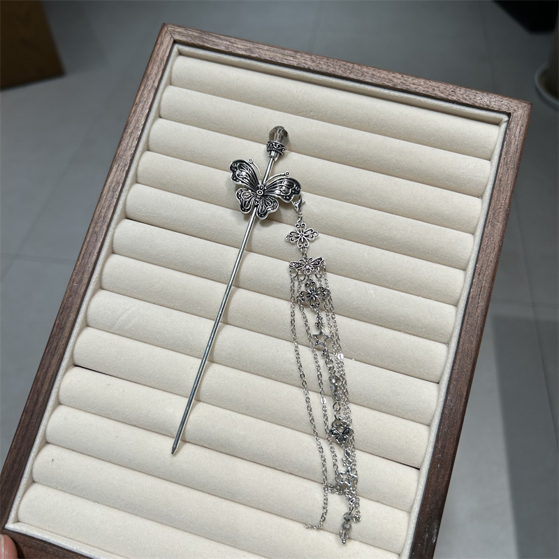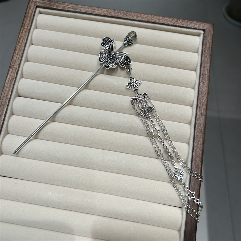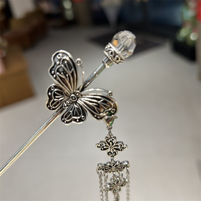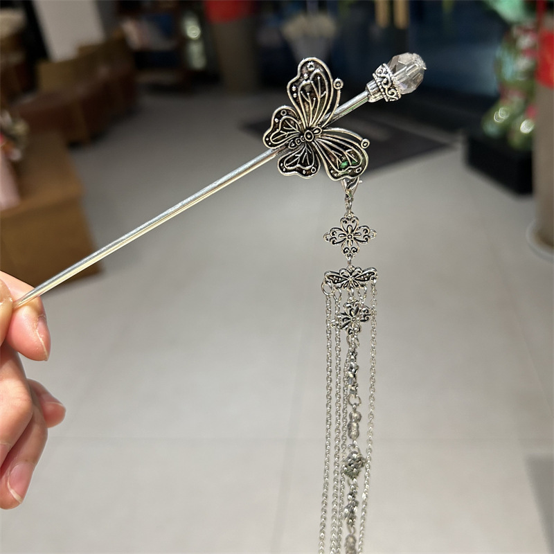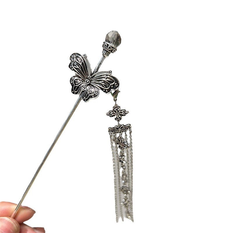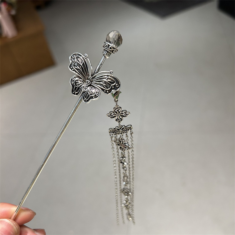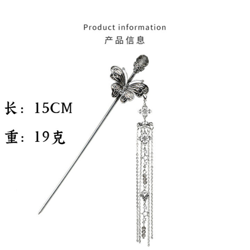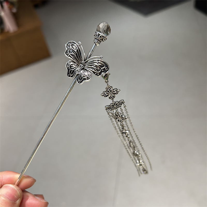 电镀古银超长流苏蝴蝶发簪汉服头饰古装马面裙古风发簪发钗盘发饰