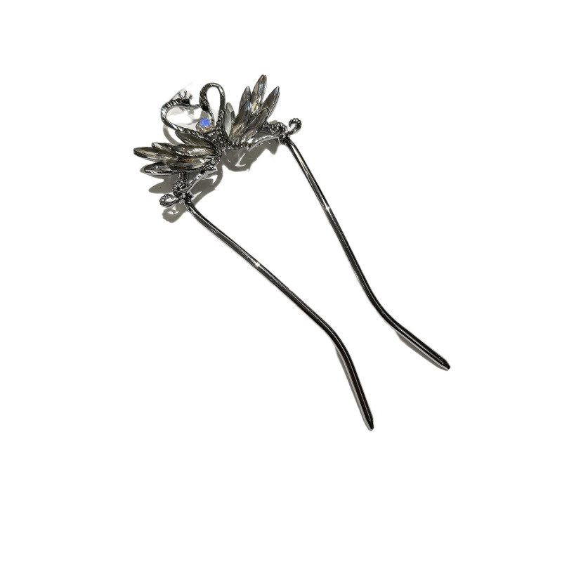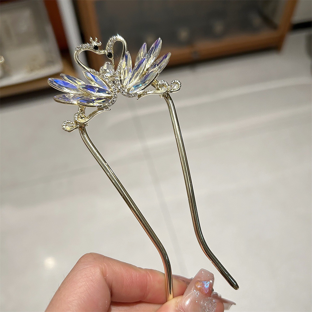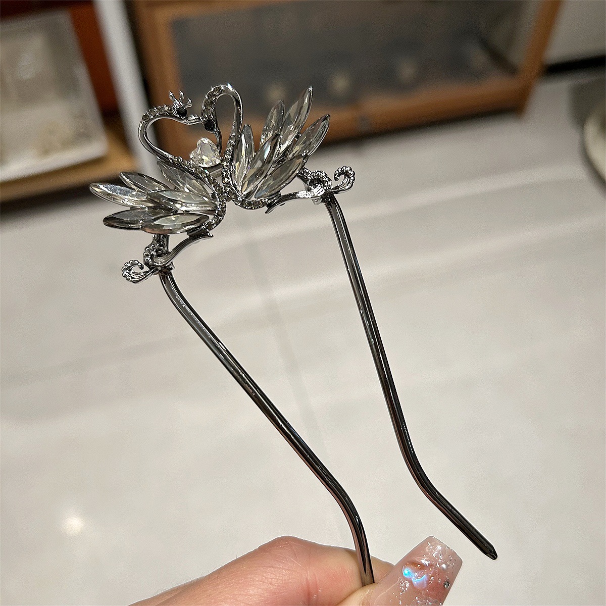 天鹅发钗高级感水钻锆石盘发器U型发簪女复古锆石水晶后脑勺发插