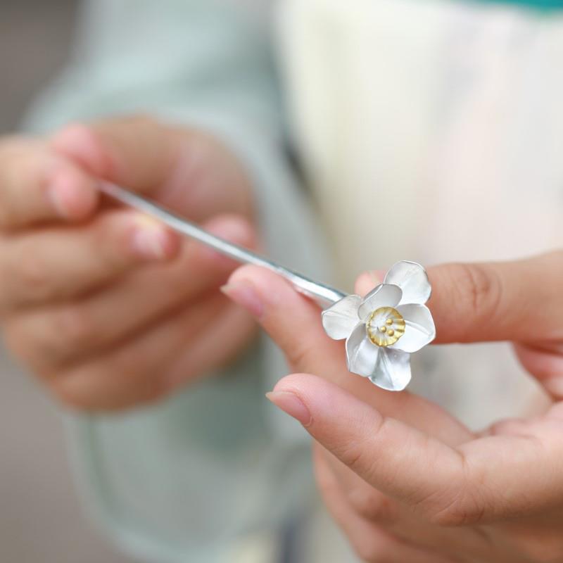 水仙花瓣S925银盘发簪子女民族风复古日常汉服旗袍配饰一字簪发饰