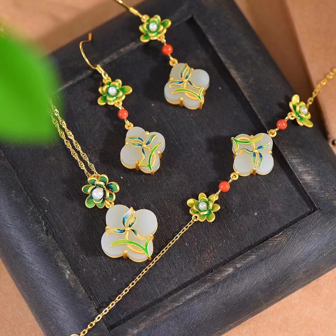 原创设计纯银镶嵌和田玉四叶草珐琅彩竹节三件套兰花耳钩手链吊坠